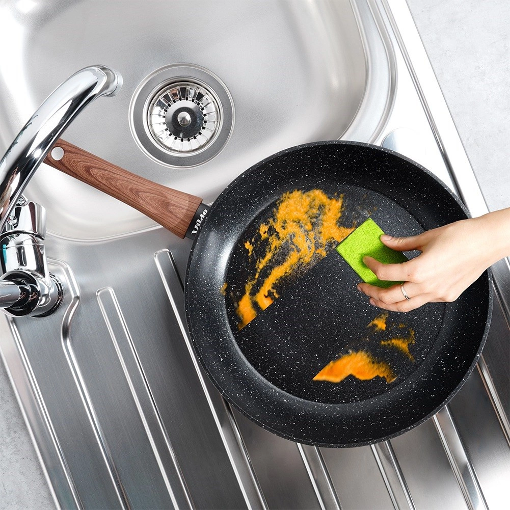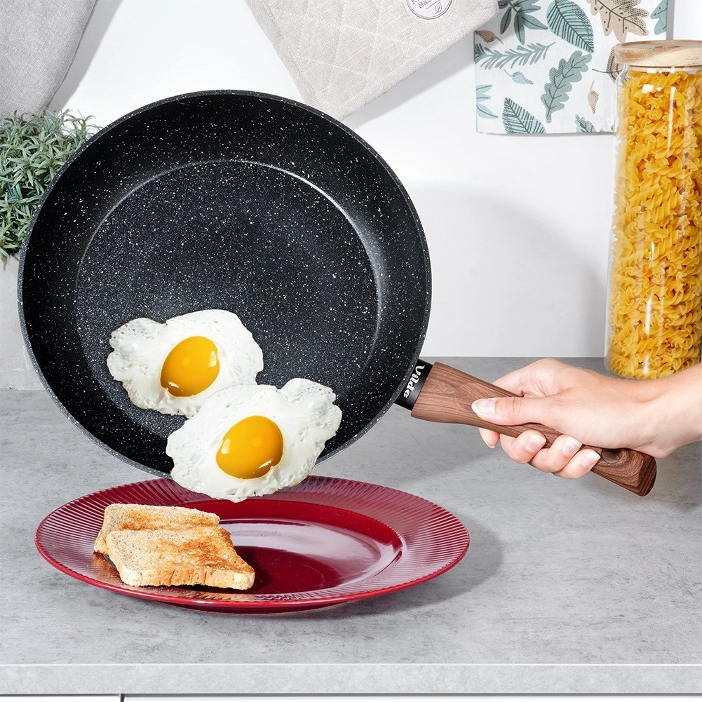 Solid pande i støbt aluminium med holdbar non-stick granitbelægning udmærker sig ved fremragende varmeledning og nem rengøring. Den moderne kombination af sort og træ passer i ethvert køkken og sikrer bekvem madlavning, stegning og simring.