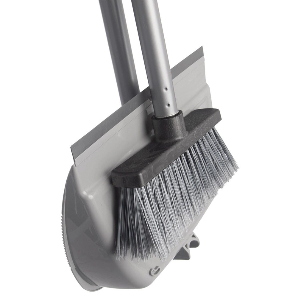 Fejebakken med gummikant slutter tæt til gulvet, og kosten med tætte børster opsamler effektivt støv, krummer og hår.