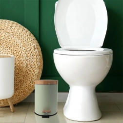 Hold hjemmet ryddeligt og stilrent med den kompakte metalskraldespand GREENISH 3 l. Kroppen i mat pastelgrøn og naturlige bambusdetaljer skaber et elegant supplement til moderne interiører. Takket være den stabile bund og lågets stille gang er den behagelig i daglig brug.