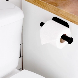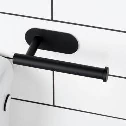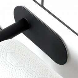 Installationen er maksimal nem – holderen fastgøres på fliser, malet væg eller anden glat overflade med den medfølgende dobbeltsidede tape, altså uden boring og uden rod. Den elegante form med endestop forhindrer, at rullen glider af, så den altid er på plads og lige ved hånden.