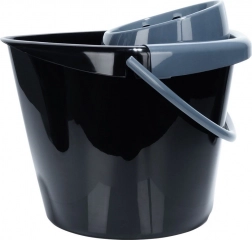 Universel spand med holdbar plastkonstruktion i sort med grå presser kombinerer lav vægt med høj modstandsdygtighed. Takket være det ergonomiske håndtag transporteres den komfortabelt selv ved fuld fyldning, og den formede udhældning sikrer kontrolleret hældning uden rod.