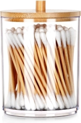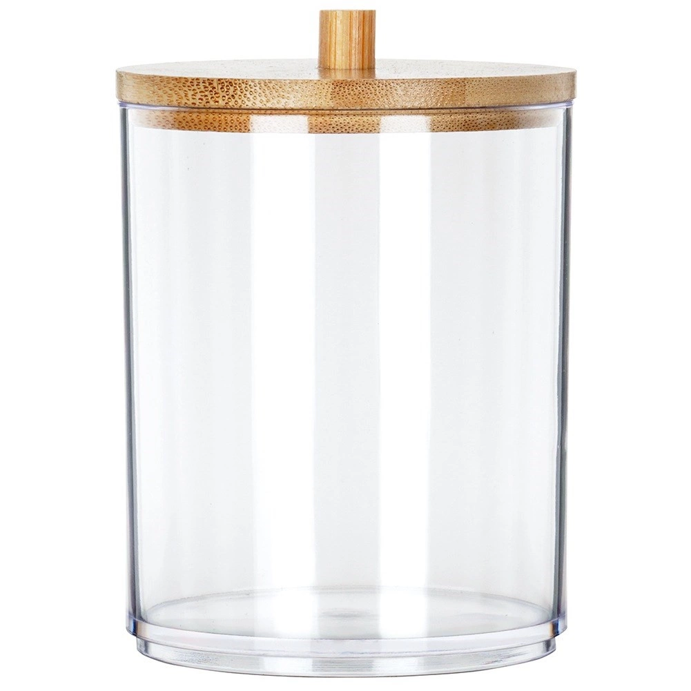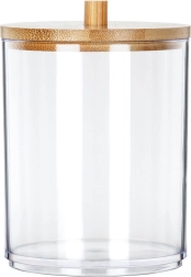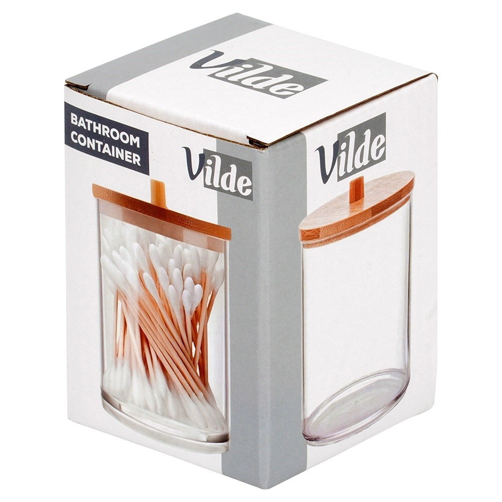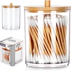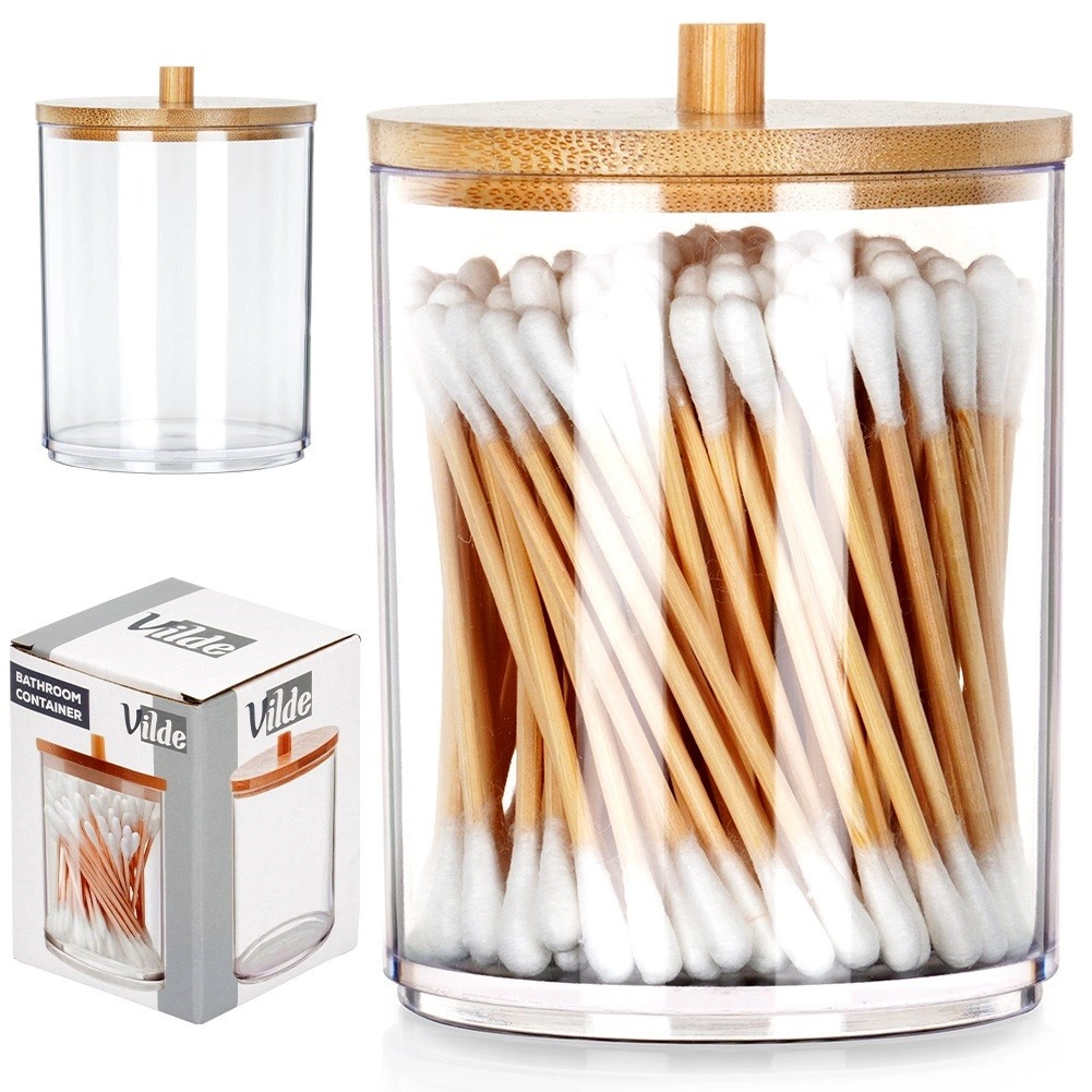 Praktisk og stilfuld beholder til vatpinde og kosmetiske vatrondeller i transparent akryl med bambuslåg, som holder dit badeværelse rent og organiseret. Takket være de kompakte mål sparer den plads, men rummer stadig alt, du behøver til den daglige pleje. Den brede åbning gør det let at genopfylde, og den gennemsigtige krop giver øjeblikkeligt overblik over indholdet.