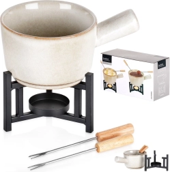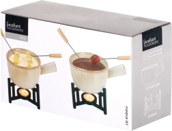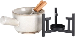 Dette kompakte fondue-sæt kombinerer kvalitetsporcelæn i en blid beige tone med et robust metalstativ i mat sort. Skålen varmes hurtigt op og holder temperaturen længe, så du kan nyde smeltet chokolade, ost og andre varme dips præcis, som du foretrækker.