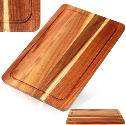 Elegant skærebræt i akacietræ med målene 37 × 25 cm og en tykkelse på 1,5 cm er ideelt til daglig skæring og stilfuld servering. Takket være den dybe saftrille langs kanten opfanges safter fra kød, frugt og grøntsager, så køkkenbordet forbliver rent. Det holdbare akacietræ er naturligt fugtbestandigt, tørrer hurtigt, absorberer ikke lugte og har antibakterielle egenskaber.
