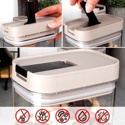 Håndtagsmekanisme med tætningsgummi forhindrer adgang af luft og fugt, hvilket holder maden sprød, velduftende og beskyttet mod skadedyr.