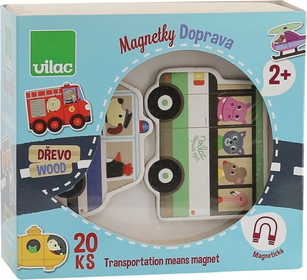 Sæt af træmagneter med motiver af transportmidler, ideelt til dekoration af børneværelset eller køleskabet. Produceret miljøvenligt og skånsomt mod naturen.
