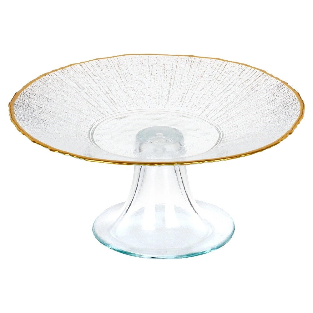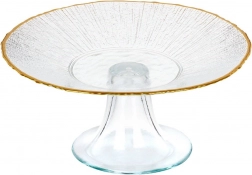 Denne stilfulde glaskageopsats udmærker sig ved sit rene design, gennemsigtige glas og den diskrete guldkant, som understreger den festlige stemning. Den hævede konstruktion på fod giver nem skæring og servering og får desserterne til at stå flot frem.