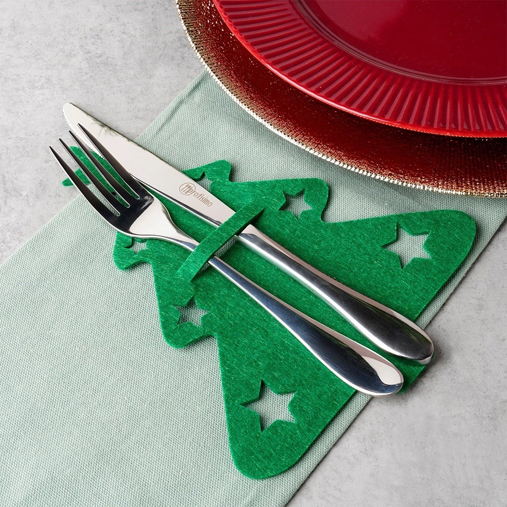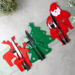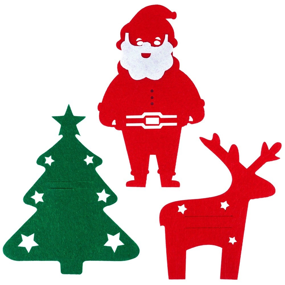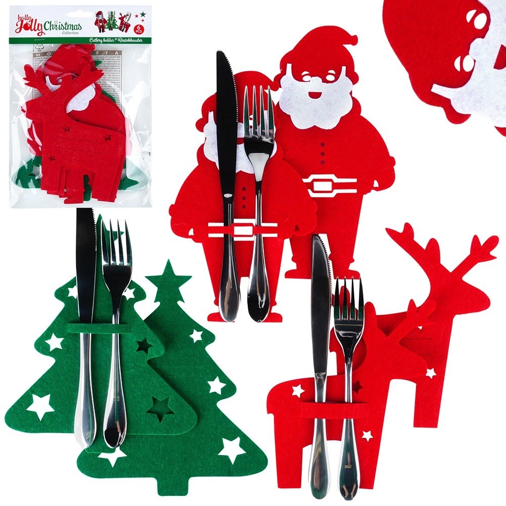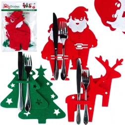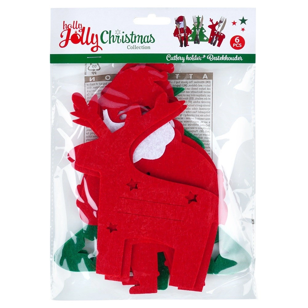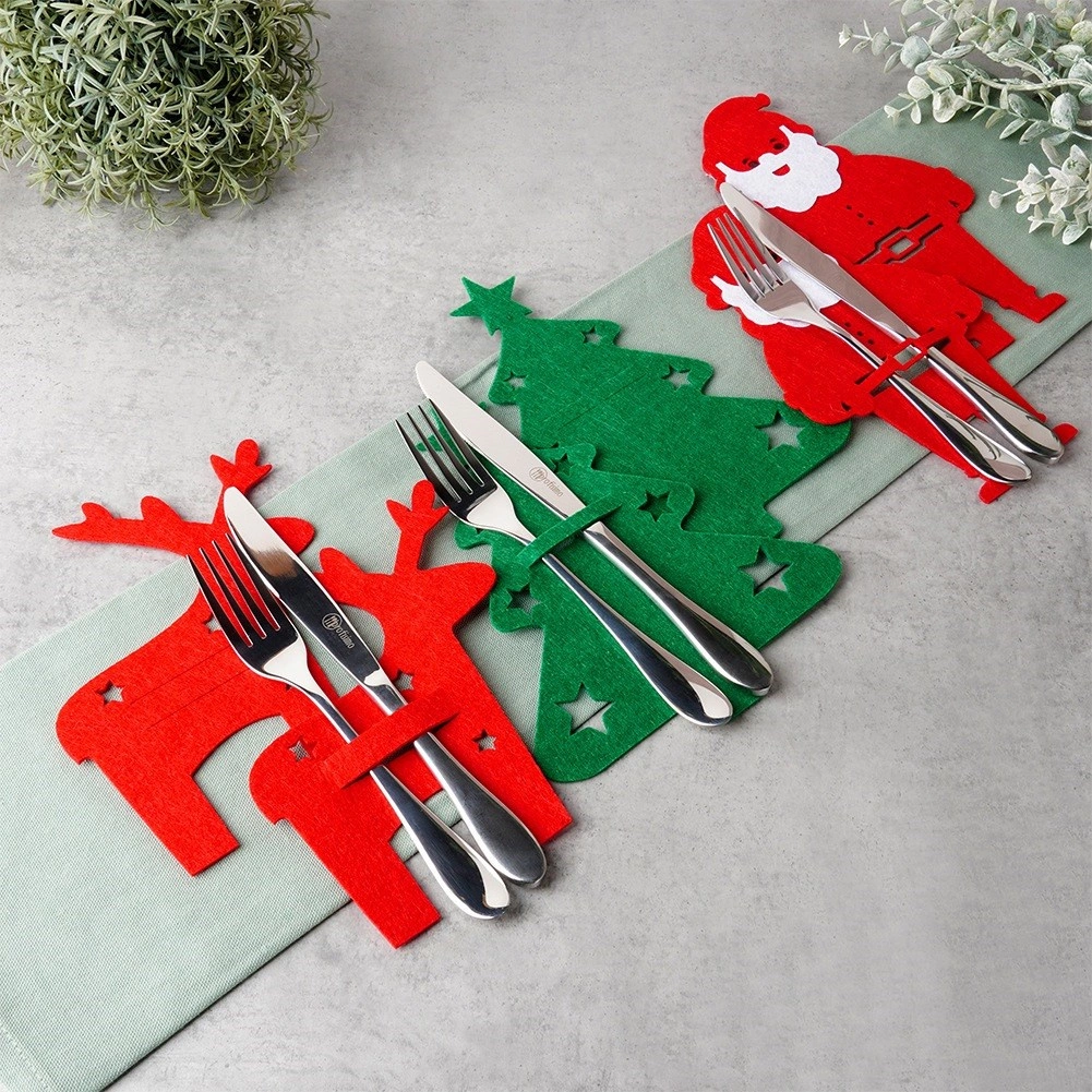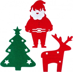 Skab en harmonisk juleborddækning med dekorative bestiketuier i blød filt. Hvert etui har en gennemføring/liste, som pålideligt holder kniv, gaffel og ske og samtidig skåner bordets overflade. Med motiverne Julemand, rensdyr og juletræ giver de opdækningen et legende, men elegant præg.