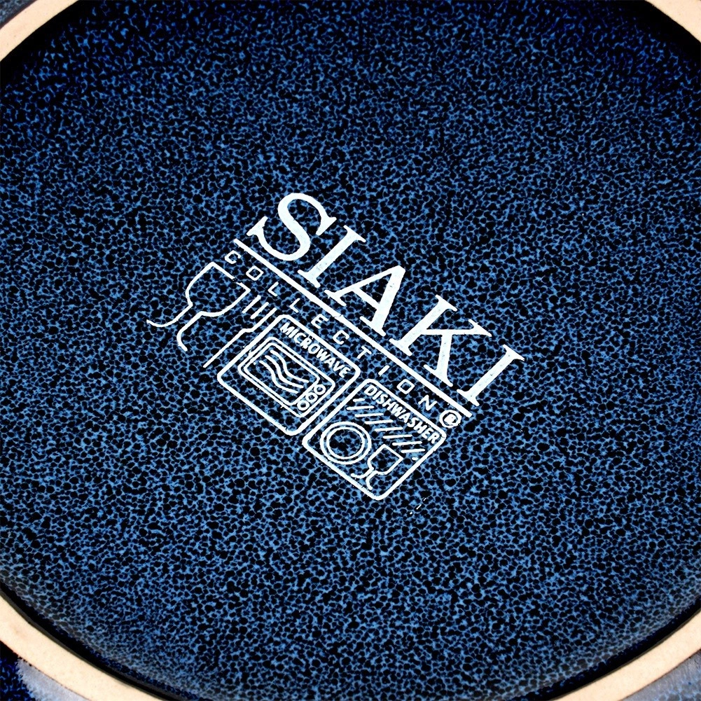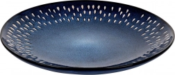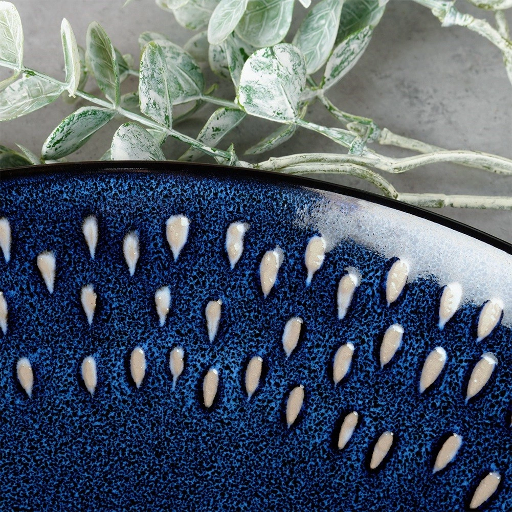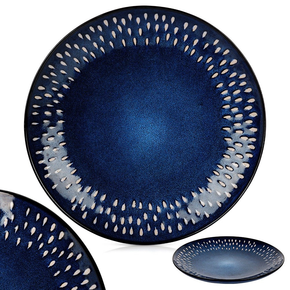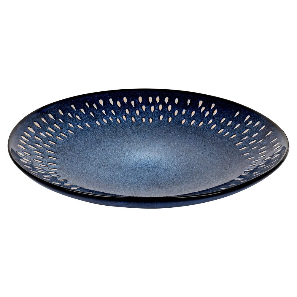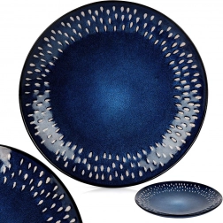 Denne stilfulde flade tallerken kombinerer en tidløs rund form med en markant glasur i granatblå nuancer og fine hvide accenter i dråbeform langs kanten. Stentøjsmaterialet (gres) udmærker sig ved højere styrke og modstandsdygtighed mod skader, så den egner sig til både daglig brug og intensiv drift.