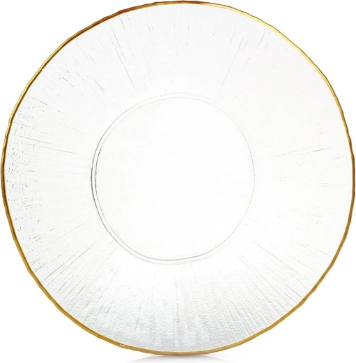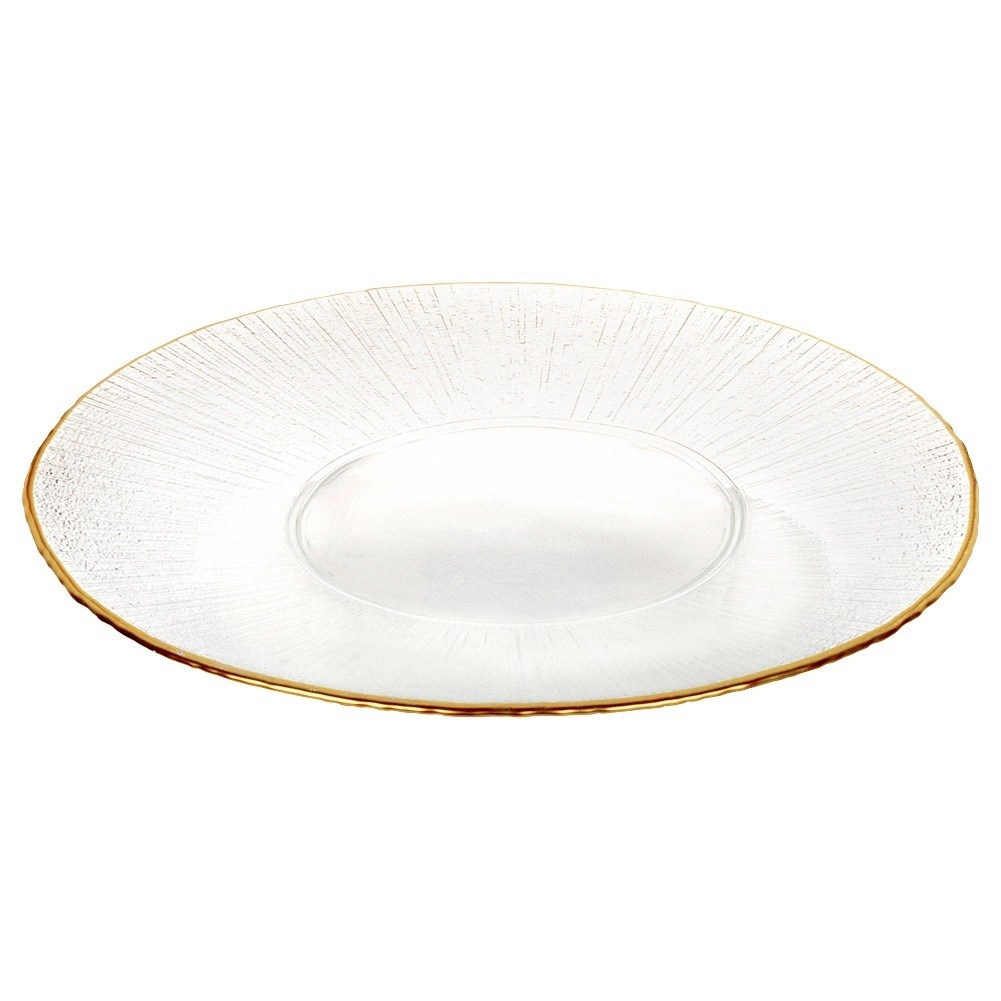Elegant glasstallerken med en diameter på 30 cm med guldkant og fin tekstur, som giver dit bord et luksuriøst udtryk. Takket være den store størrelse fungerer den ikke kun som en middagstallerken, men også som et stilfuldt fad til kager, frugt eller forretter. Fremstillet af kvalitets klart glas, der imiterer krystal-looket.