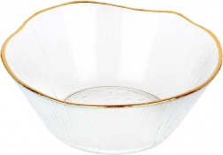 Denne stilfulde glaskål med gylden kant udmærker sig ved et moderne design og en diskret tekstureret overflade, der minder om krystal. Det transparente glas fremhæver smukt farverne på de serverede retter og giver enhver borddækning et strejf af luksus.
