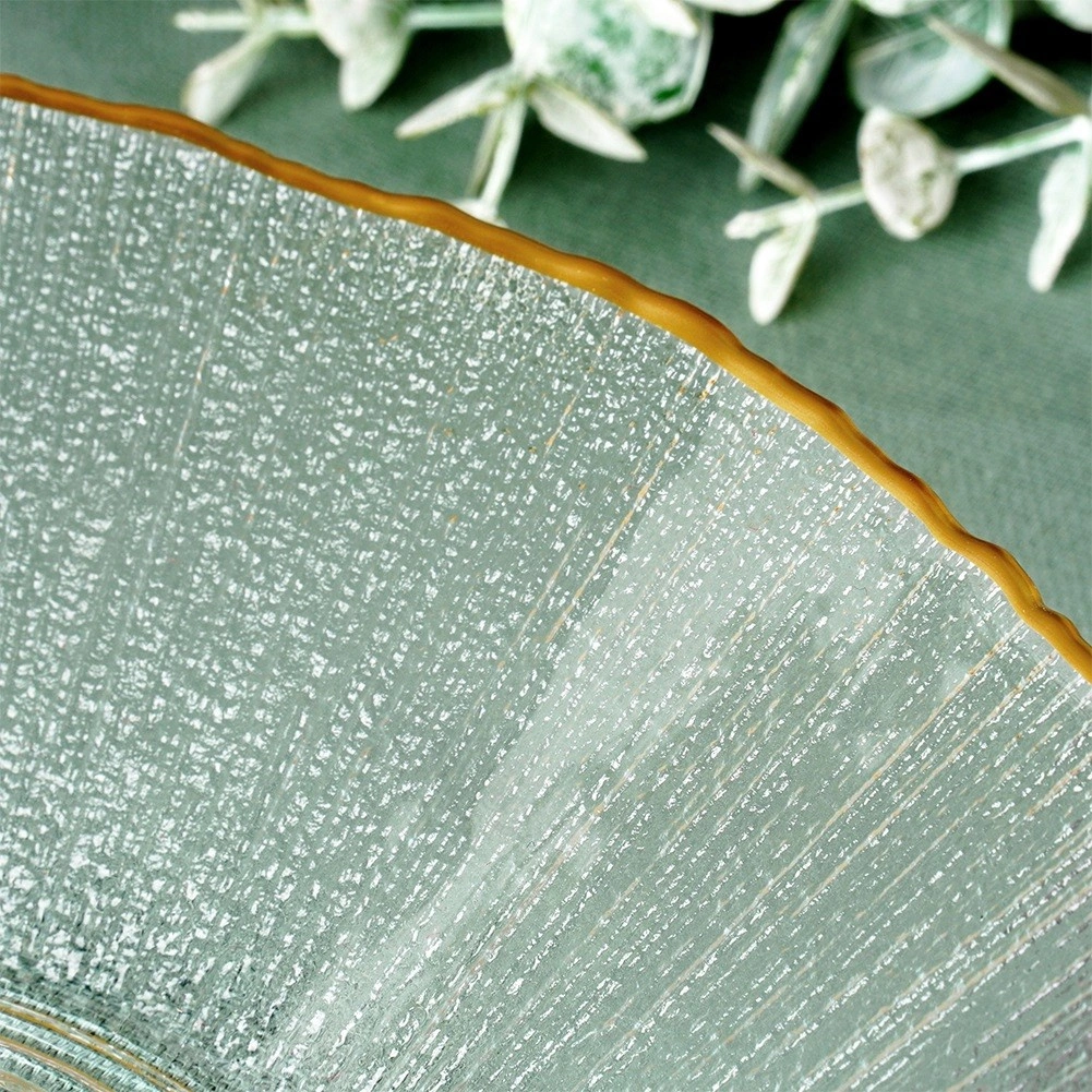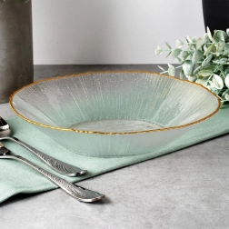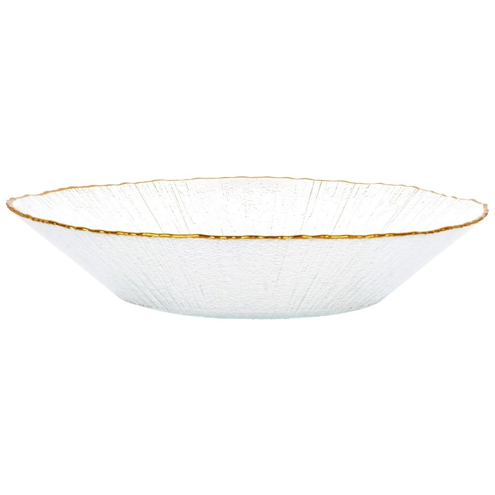 Denne stilfulde skål i klart glas med dekorativ guldkant udmærker sig med moderne form og en let bølget, uregelmæssig kant, der minder om slebet krystal. Perfekt til hverdagsbrug og festlig borddækning – fra grøntsags- og frugtsalater til snacks, popcorn eller mindre portioner pasta.