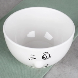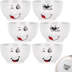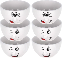 Gør bordet gladere med dette sæt af 6 hvide keramiske skåle med en kapacitet på 550 ml og en diameter på 13,5 cm. Hver skål har et legende motiv med smilende ansigt, er egnet til opvaskemaskine og mikroovn og passer perfekt til supper, morgenmadsprodukter, yoghurt og snacks. Holdbar keramik og klassisk form sikrer lang levetid og et smukt udseende ved enhver lejlighed.