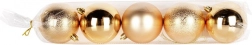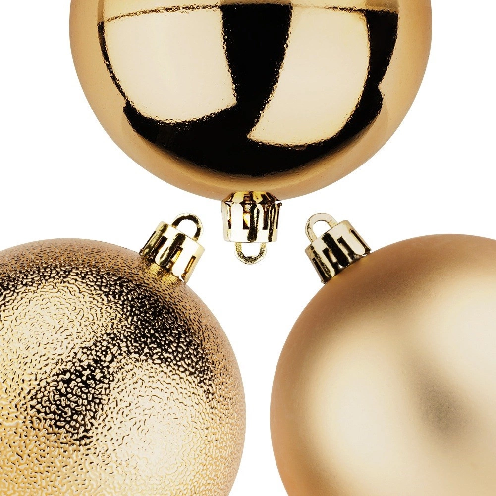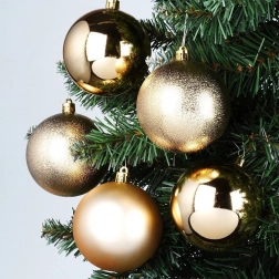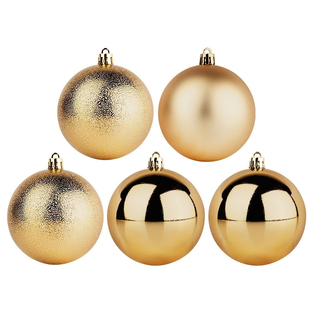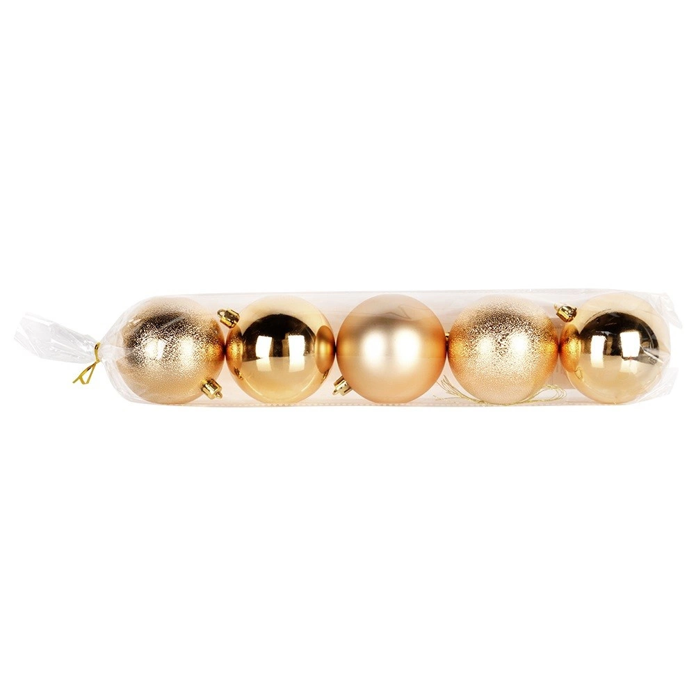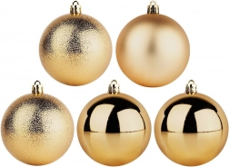 Giv din juleudsmykning harmoni og glans med et sæt på 5 gyldne kugler med en diameter på 8 cm. Det holdbare, uknuselige design efterligner glas troværdigt, men giver højere sikkerhed og længere levetid. Kombinationen af blanke, matte og strukturerede overflader skaber en effektfuld kontrast og dybde i dekorationen.
