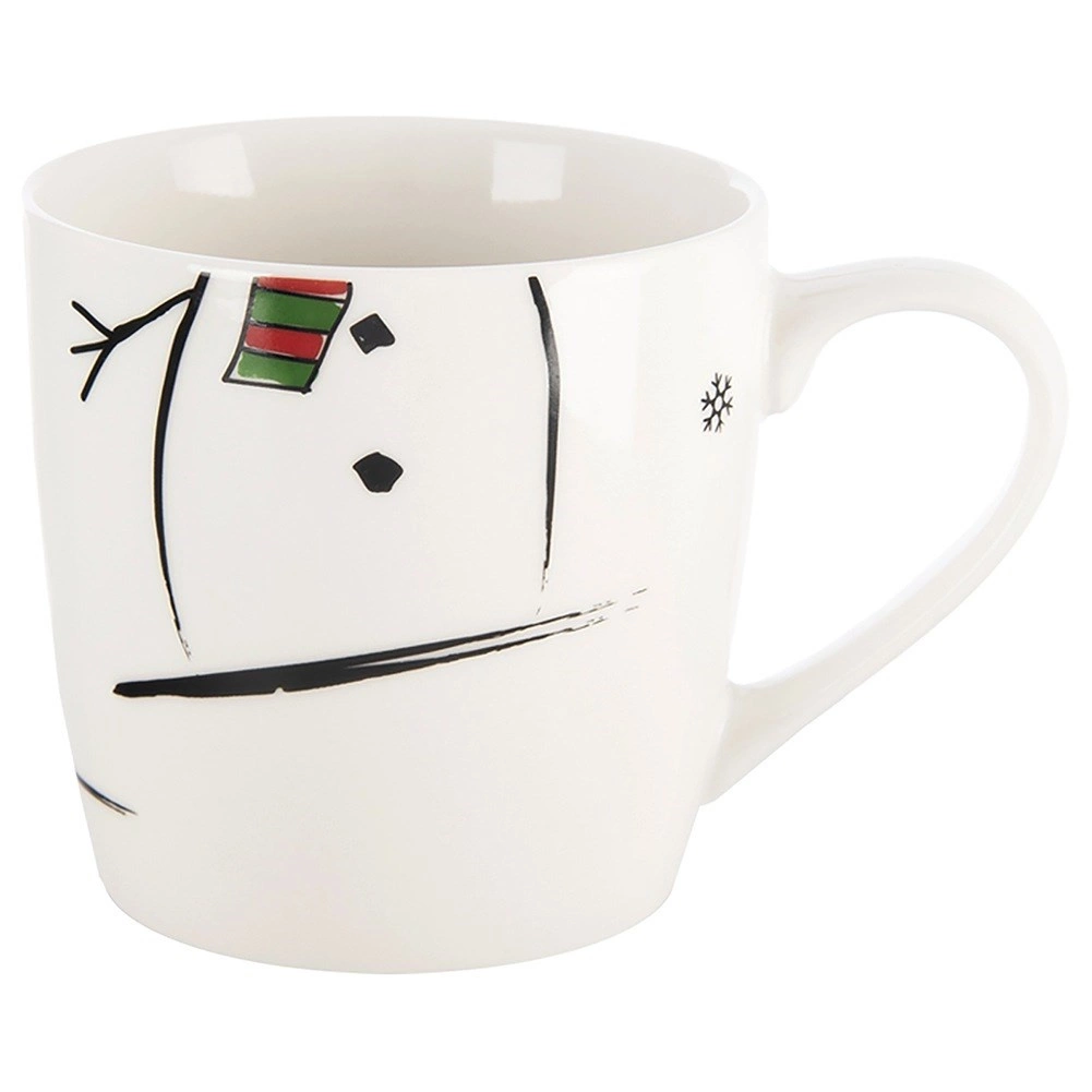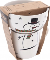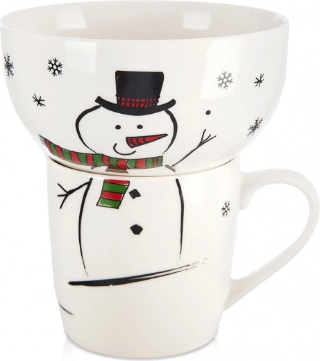 Krus og skål skaber sammen et iøjnefaldende snemandstema med halstørklæde og snefnug – perfekt til vinterstemning og børns spiseglæde ved bordet.