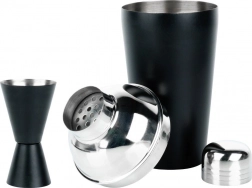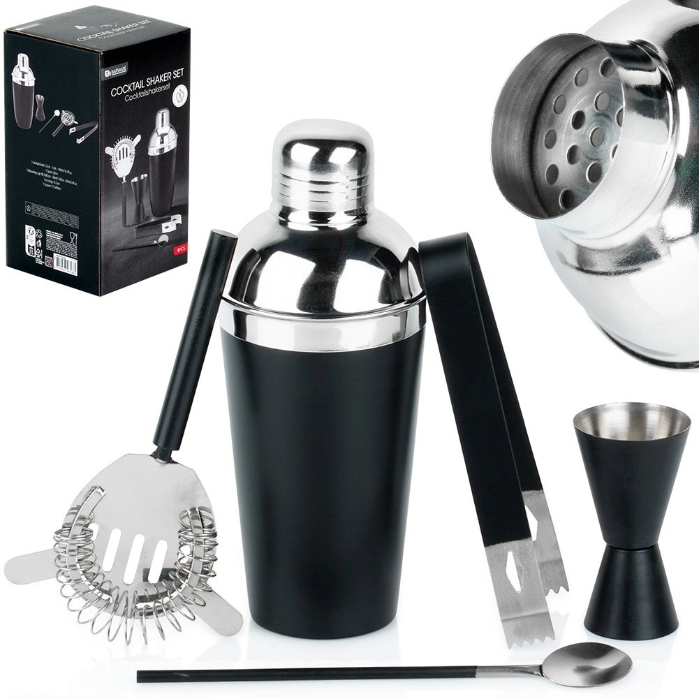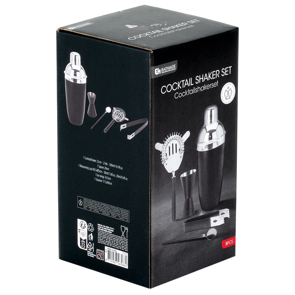 Stilfuldt barsæt med sort rustfri shaker til hjemme- og professionel brug. Indeholder 5 nøgleværktøjer til cocktailtilberedning: shaker 500 ml, dobbelt jigger 20/50 ml, Hawthorne-si, barske og istang. Mat sort finish, holdbart rustfrit stål og nem vedligeholdelse for lang levetid.