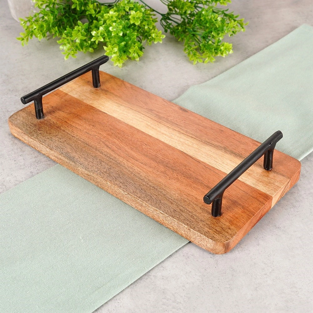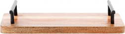 Opdag et praktisk og dekorativt tilbehør til dit køkken og spisestue. Denne rektangulære træbakke i akacietræ med robuste metalhåndtag sikrer sikker transport af kaffe, te, desserter og mindre retter. Den naturlige træstruktur og loft-look giver borddækningen et elegant præg.