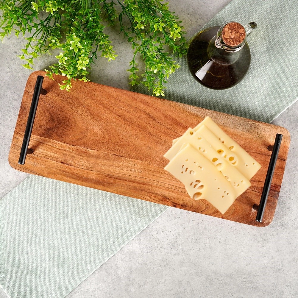 Elegant serveringsbræt i akacietræ med sorte metalhåndtag for nem transport. Ideelt til oste, forretter, desserter og morgenmad, perfekt til både hjemmet og gastronomi. Naturtræ i industriel stil giver borddækningen et unikt udtryk. Mål: 40 × 15,5 × 5 cm.