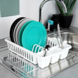 Den robuste plastkonstruktion er let, hygiejnisk og nem at rengøre. Det tidløse design passer til både moderne og traditionelle køkkener og sikrer god luftgennemstrømning for hurtigere tørring uden våde mærker på bordpladen.