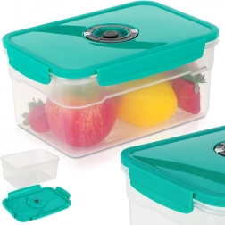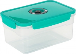 Hold dine fødevarer friske længere med en vakuumdåse på 2,3 l og mål 23 × 16 × 11 cm. Takket være den integrerede ventil i låget kan du nemt suge luften ud (med en håndpumpe) og minimere oxidation og tab af smag. Den gennemsigtige krop gør det let at se indholdet, og det turkise låg med fire klips sikrer en pålidelig og lufttæt lukning.