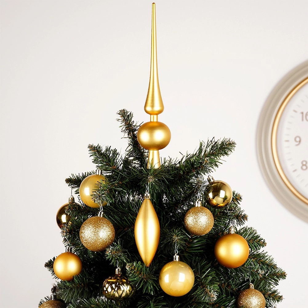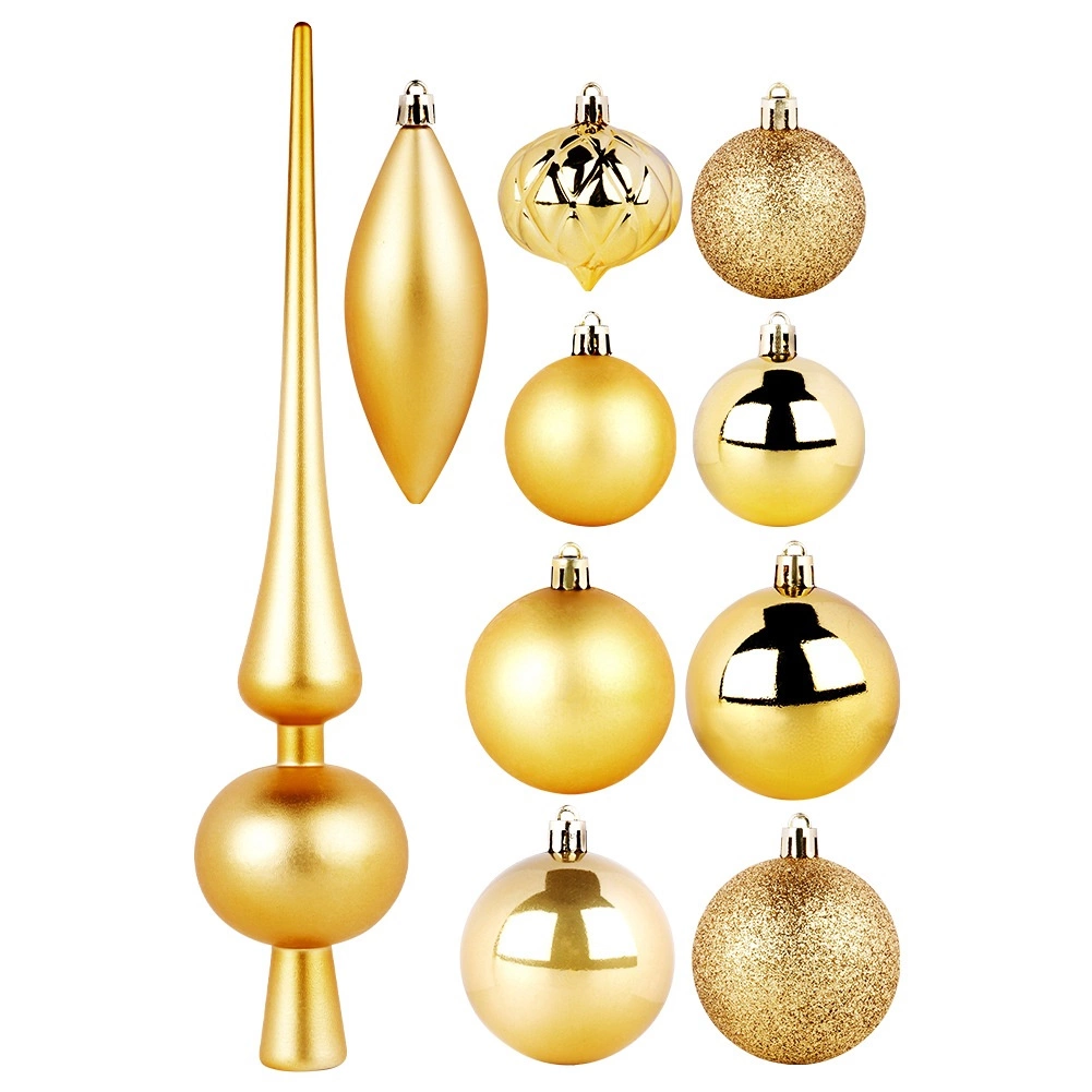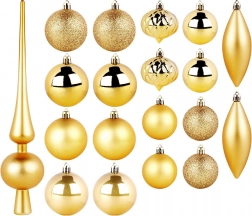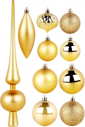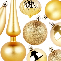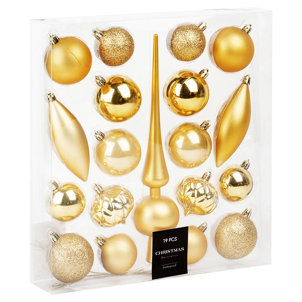 Dette alsidige sæt med 19 gyldne pyntedele kombinerer forskellige former og overflader for et rigt og balanceret udtryk på træet. Du får matte, blanke, perlemorsskinnende og glitrende kugler, en elegant top og et par dråber. Det lette og holdbare materiale sikrer pålidelighed og lang levetid uden risiko for at gå i stykker.