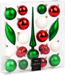 I pakken finder du en top i mat grøn, elegante dråber og en blanding af kugler i populære juletoner. Ornamenterne har praktiske øskner og snore til hurtig ophængning.
