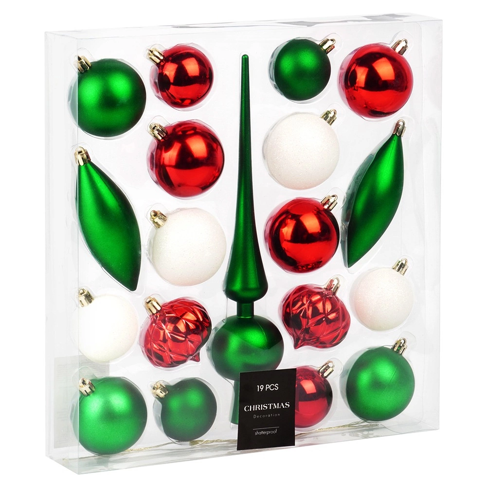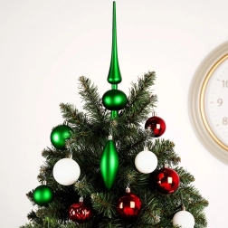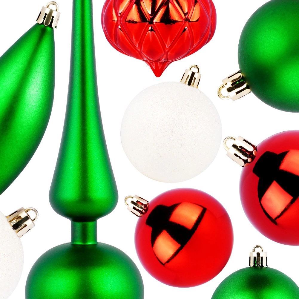 Sættet omfatter en høj top, runde kugler og to dråbeornamenter for et afbalanceret og festligt udtryk på træet.