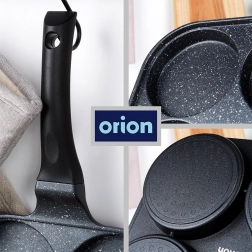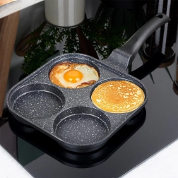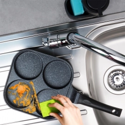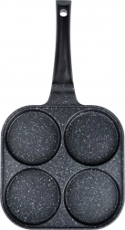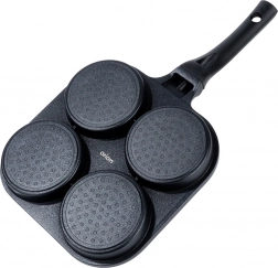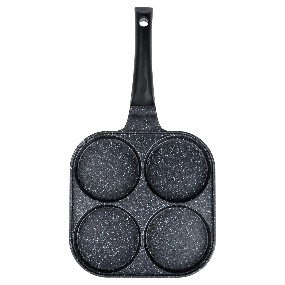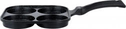 Den firkantede pande 22 × 22 cm med fire separate kamre sikrer ensartede portionsstørrelser og et perfekt udseende på morgenmaden. Aluminiumskroppen med granit nonstick-belægning varmes hurtigt op og fordeler varmen effektivt, så du steger hurtigt, energibesparende og uden at brænde på. Ergonomisk, skridsikker håndtag med ophængningshul giver komfortabel og sikker brug.