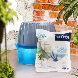 Udskiftningen er hurtig og ren – tabletten opløses gradvist, og det kondenserede vand forbliver i enhedens nederste beholder. Afhængigt af luftfugtighed og temperatur holder én tablet omtrent 2–5 måneder i rum på ca. op til 20 m².