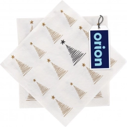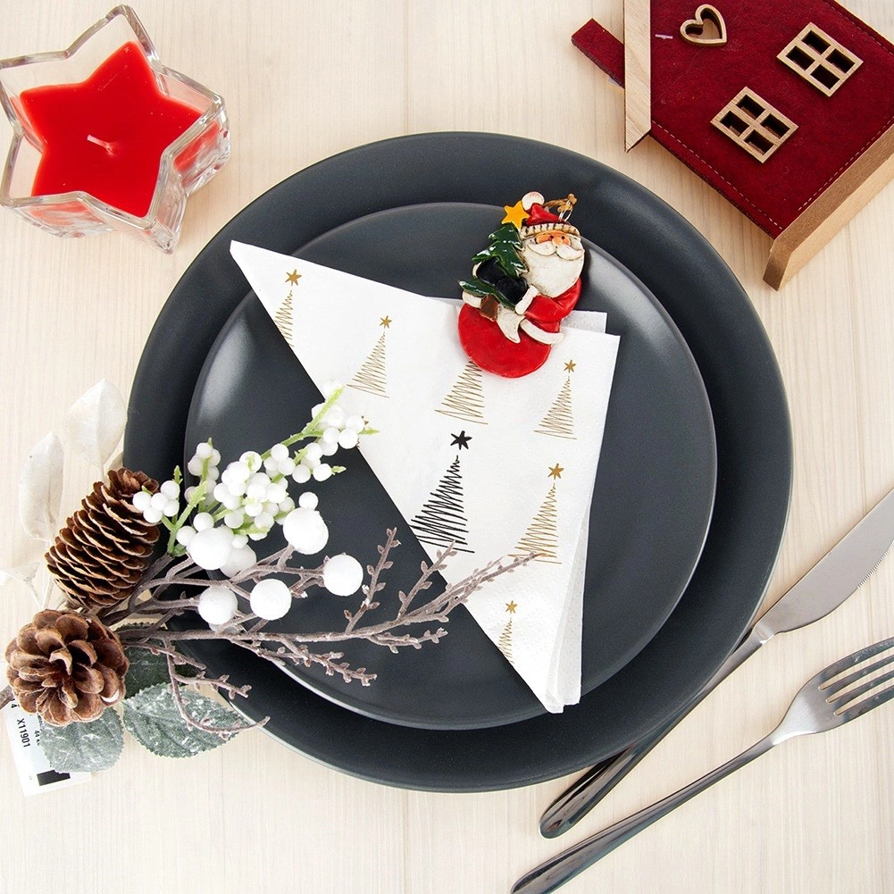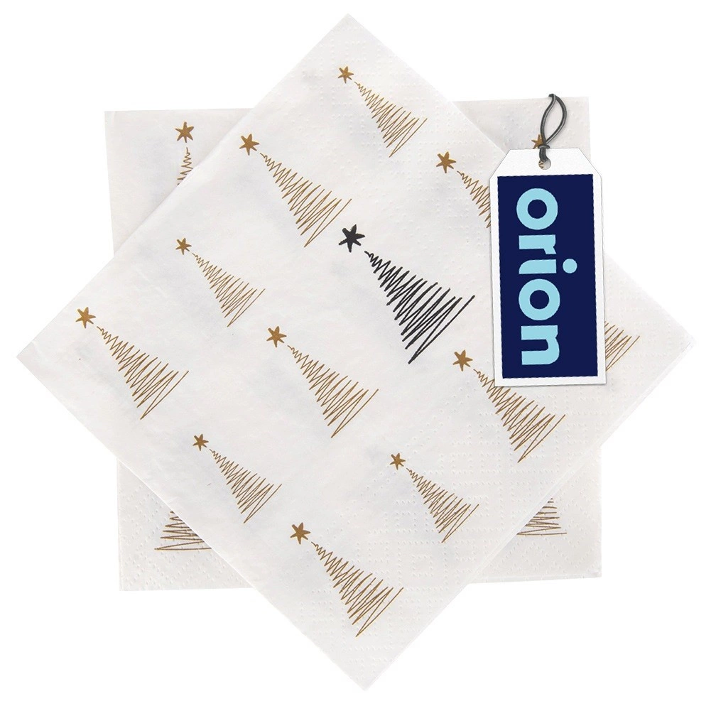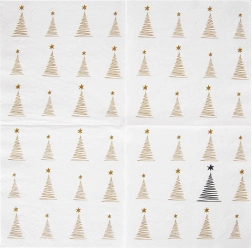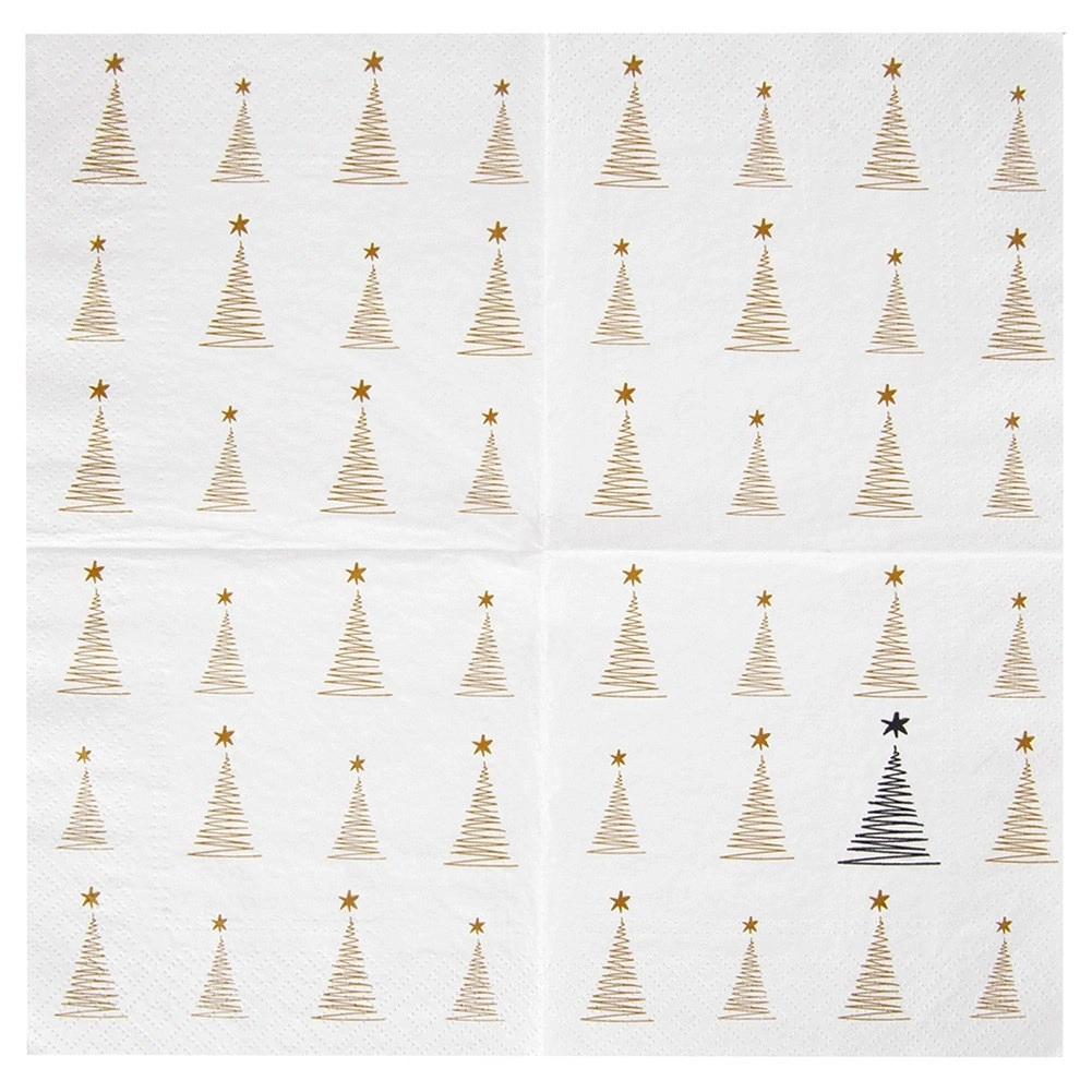 Stilfulde papirservietter til det festlige bord med elegant gyldent tryk af små træer. 3-lags kvalitet for højere holdbarhed og høj sugeevne, praktisk engangsbrug og mål 33 × 33 cm udfoldet. Ideelle til jul, fester og daglig borddækning.
