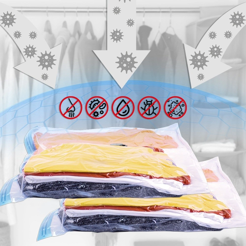 Sættet med vakuumposer er en smart løsning til daglig organisering i hjemmet og på rejser. Læg tingene i, luk med dobbeltlynlås, og brug støvsuger eller håndpumpe til at suge luften ud via ventilen. Indholdet komprimeres, forbliver overskueligt opbevaret og beskyttet mod snavs.