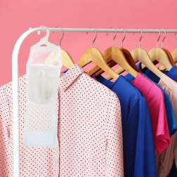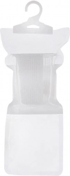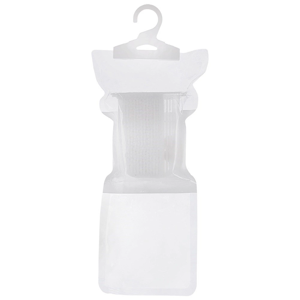 Takket være den praktiske krog hænger du den nemt på en bøjlestang eller en vægkrog. Det absorberende CaCl₂-granulat binder fugt fra luften og omdanner den til vand, som samles i posens nederste del. Når den er fyldt, udskiftes produktet.