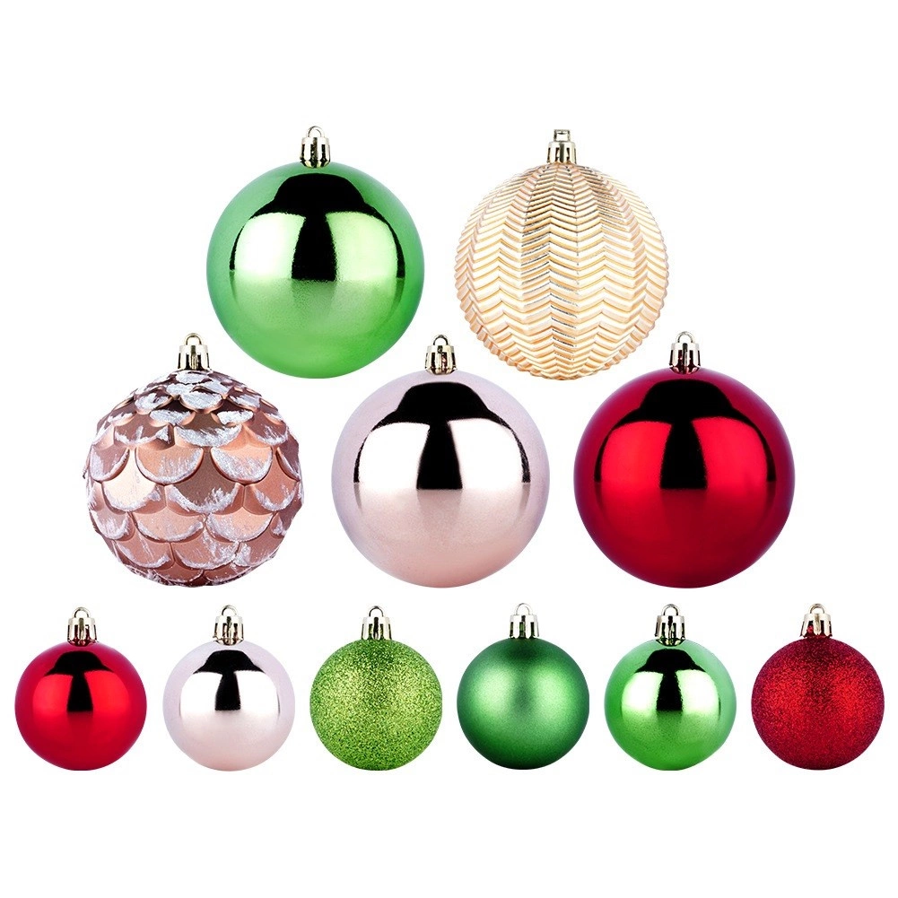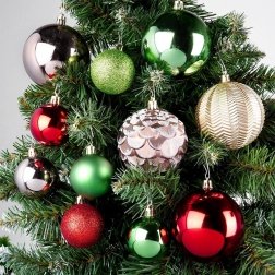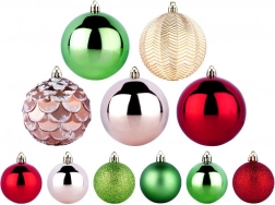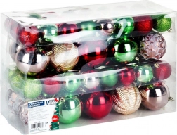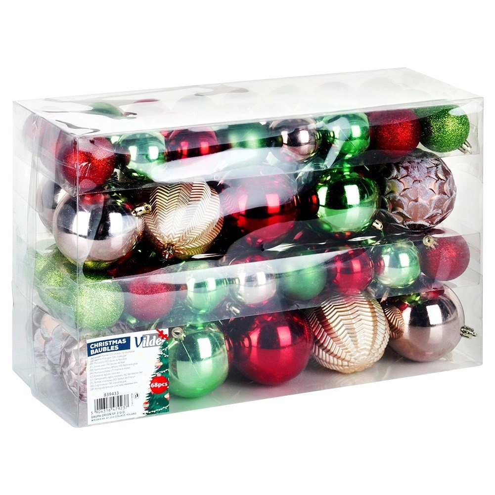 I pakken finder du 20 kugler med diameter 8 cm (blanke røde, reliefformede gyldne, blanke og reliefformede lyserøde, blanke grønne) og 48 stk med diameter 5 cm (blanke røde 6×, glitrende grønne 6×, blanke lyserøde 6×, glitrende røde 12×, blanke grønne 12×, matte grønne 6×). Hver kugle har en metaløje, og der medfølger snore til øjeblikkelig pyntning.