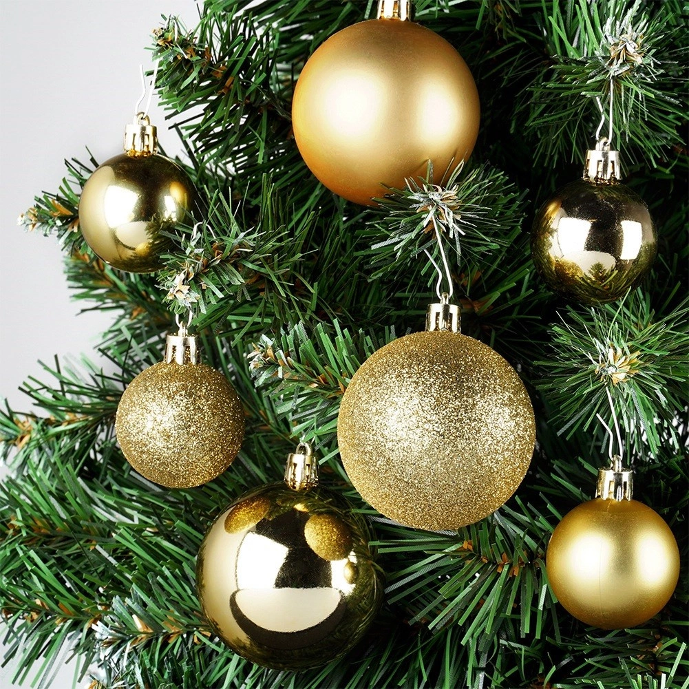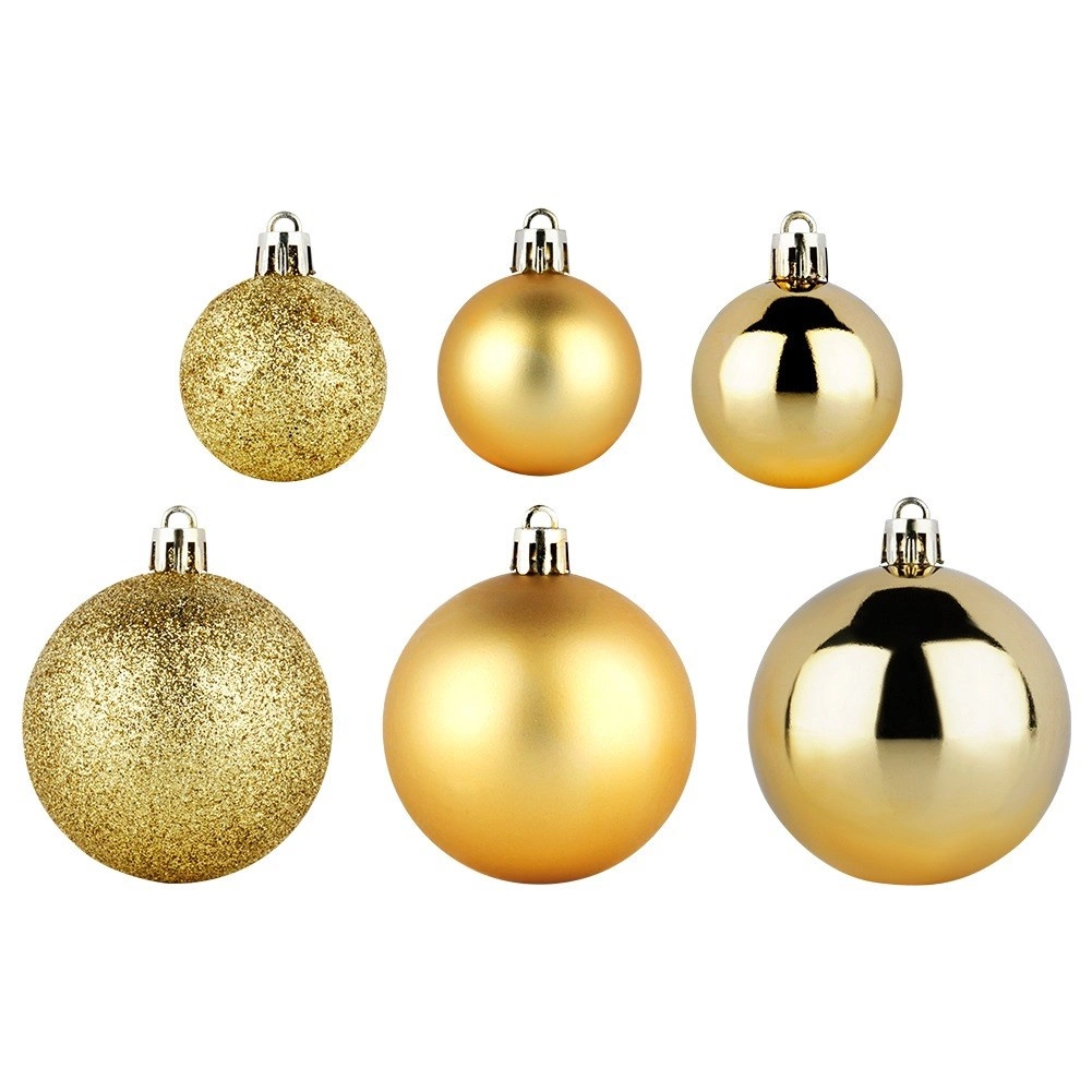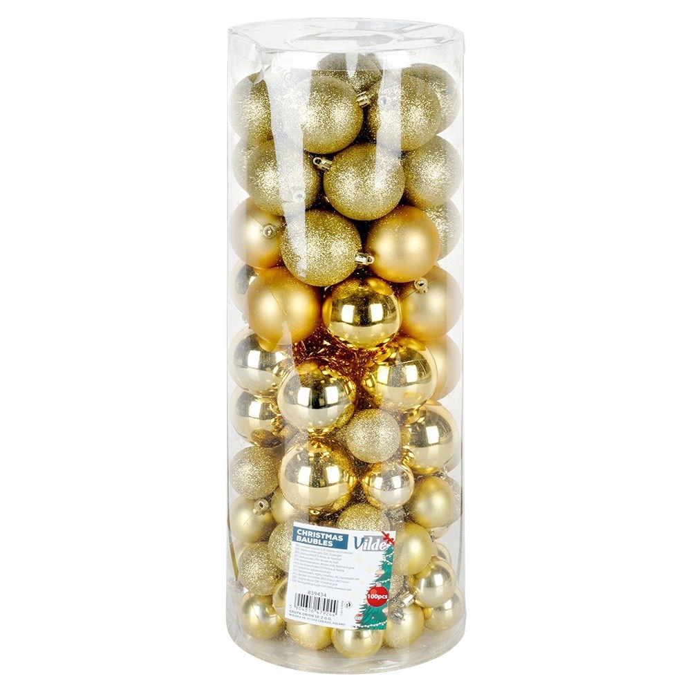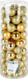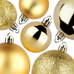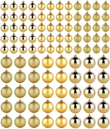 Skab en magisk stemning derhjemme med sættet af 100 gyldne kugler, som kombinerer matte, blanke og glitrende overflader. Den uknuselige udførelse i plast af høj kvalitet sikrer sikkerhed og holdbarhed, samtidig med at de troværdigt ligner glas. Takket være de to størrelser 4 og 6 cm opnår du nemt et rigt og afbalanceret udtryk på juletræet.