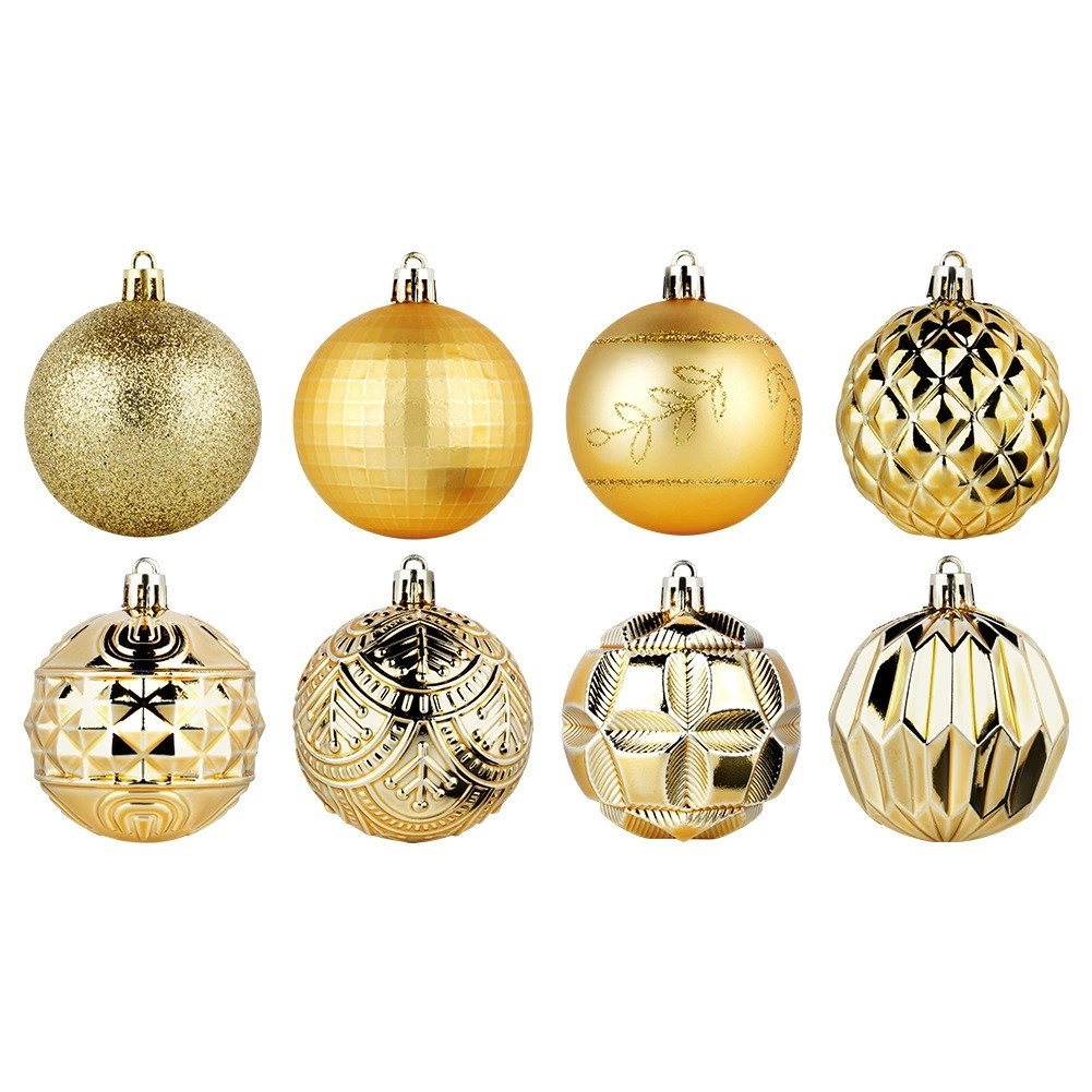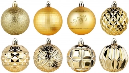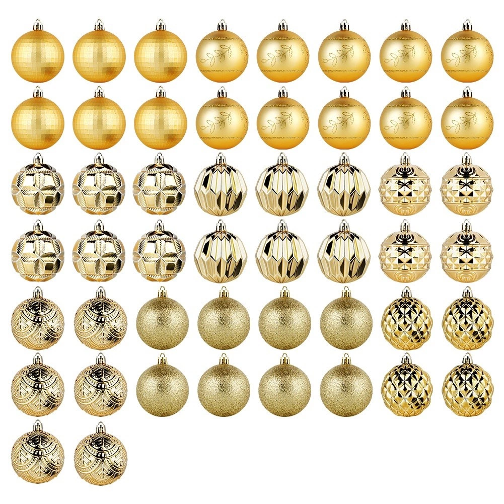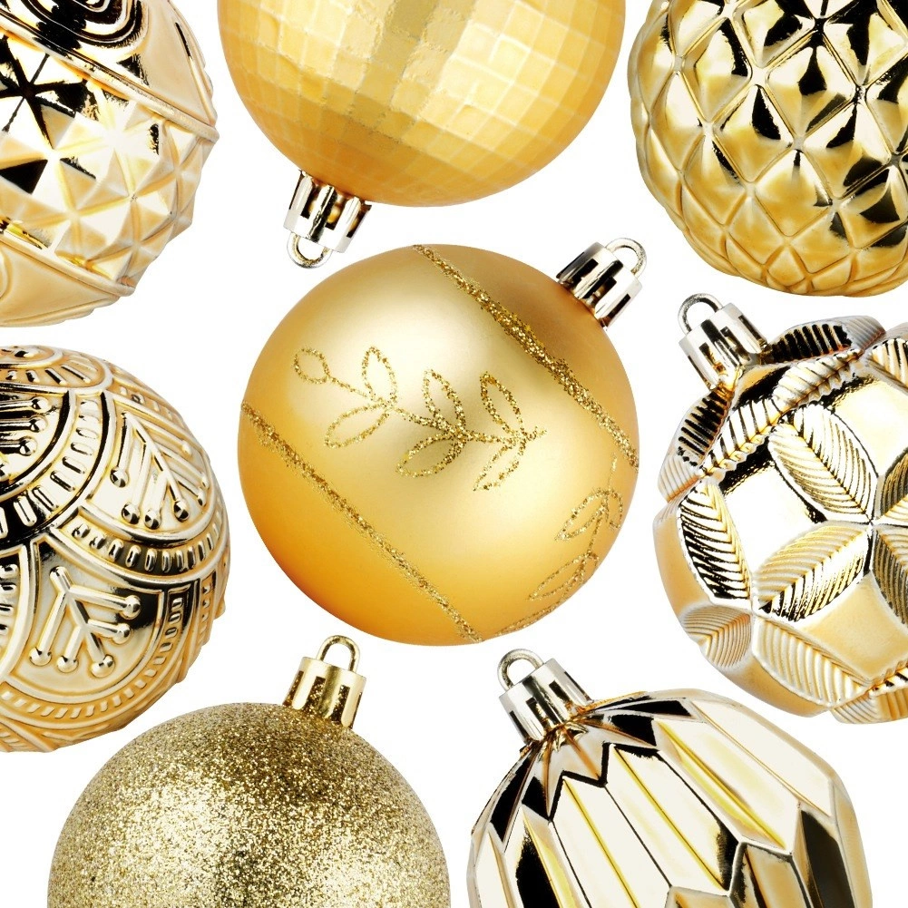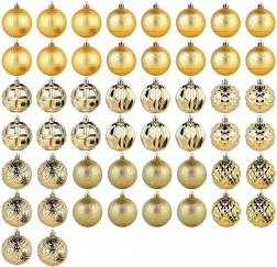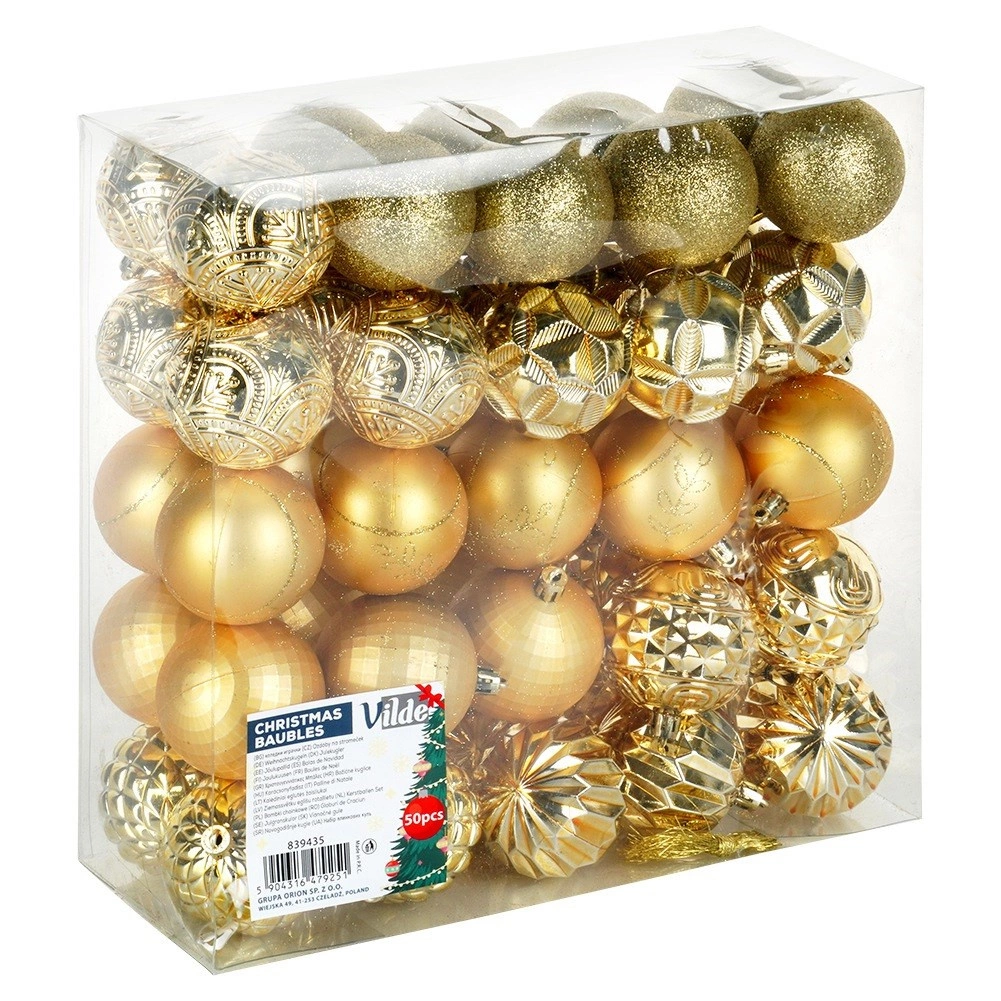 Skab en magisk juleudsmykning med et rigt sæt på 50 stk. i en ensartet gylden tone. Ornamenterne virker luksuriøse og giver, takket være de forskellige teksturer og dekorer, træet og arrangementer dybde og glans. De er fremstillet af et holdbart materiale, der minder om glas, men er mere sikkert og mere holdbart.