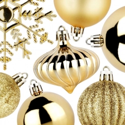 Skab en unik julestemning derhjemme med Vilde-sættet i guld. Kuglerne er lavet af kvalitetsplast, så de er uknuselige og markant mere holdbare end glas, samtidig med at de bevarer et elegant glaslook. De forskellige overfladefinish i én farve muliggør en harmonisk og samtidig dynamisk udsmykning af juletræ, kranse eller guirlander.