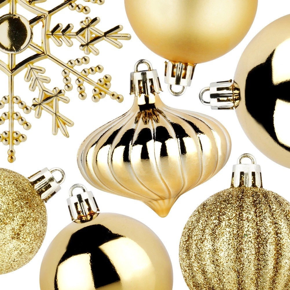 Blank, mat, glitrende og reliefpræget pynt i en ensartet guldfarve skaber en harmonisk, men visuelt rig dekoration.