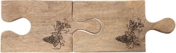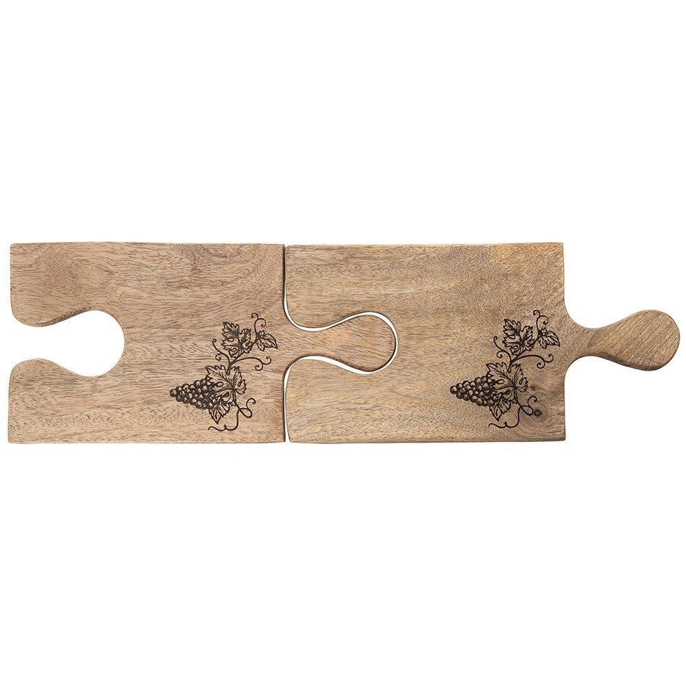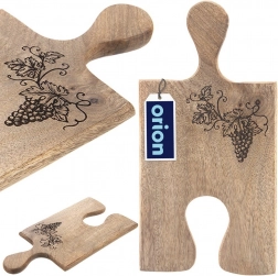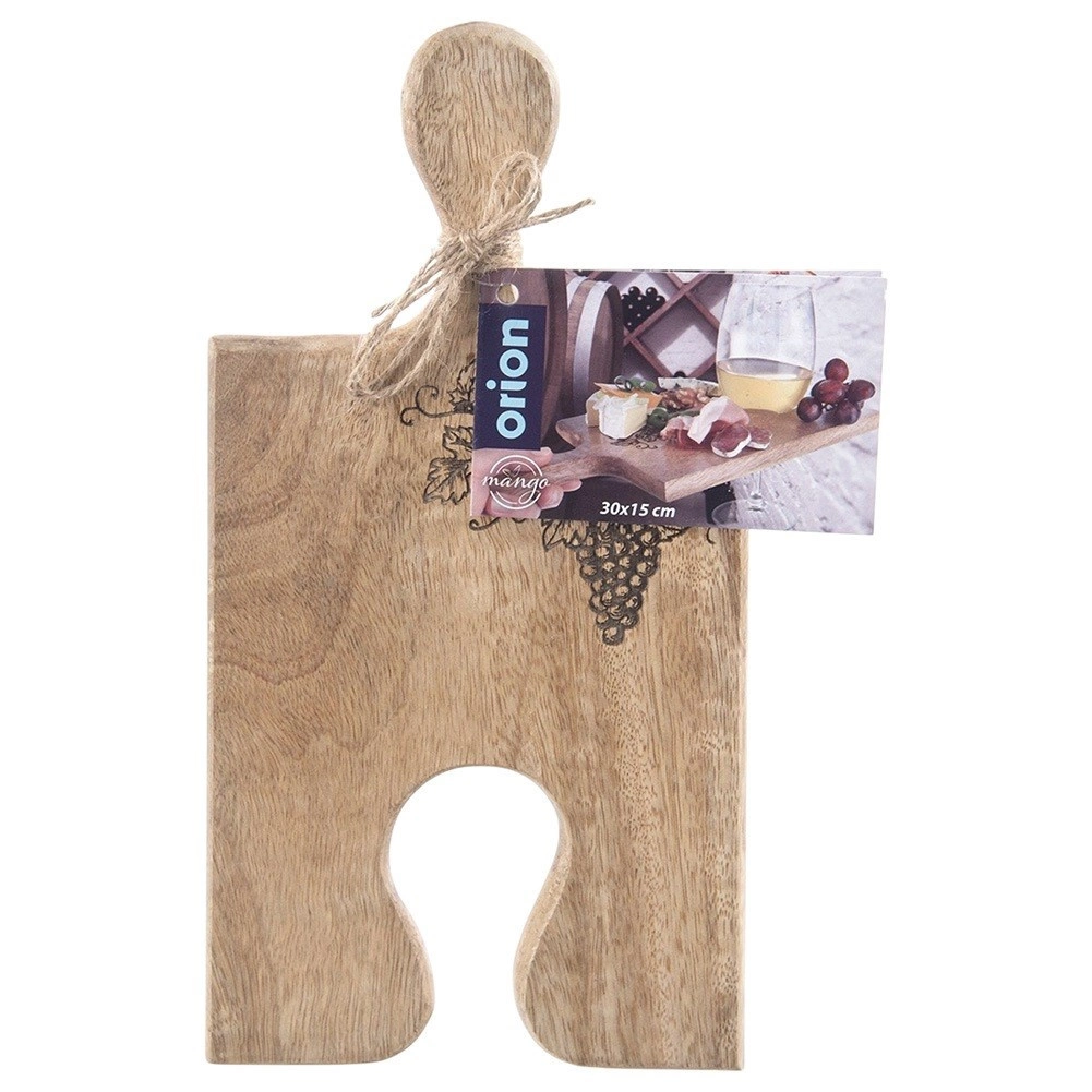Stilfuldt træbræt af mangotræ med original puslespilsform, ideelt til skæring og servering af oste, pålæg og snacks. Det holdbare mangotræ, det komfortable håndtag og den dekorative gravering af drueklaser gør det til et praktisk og elegant tilbehør til ethvert køkken og til smagninger.
