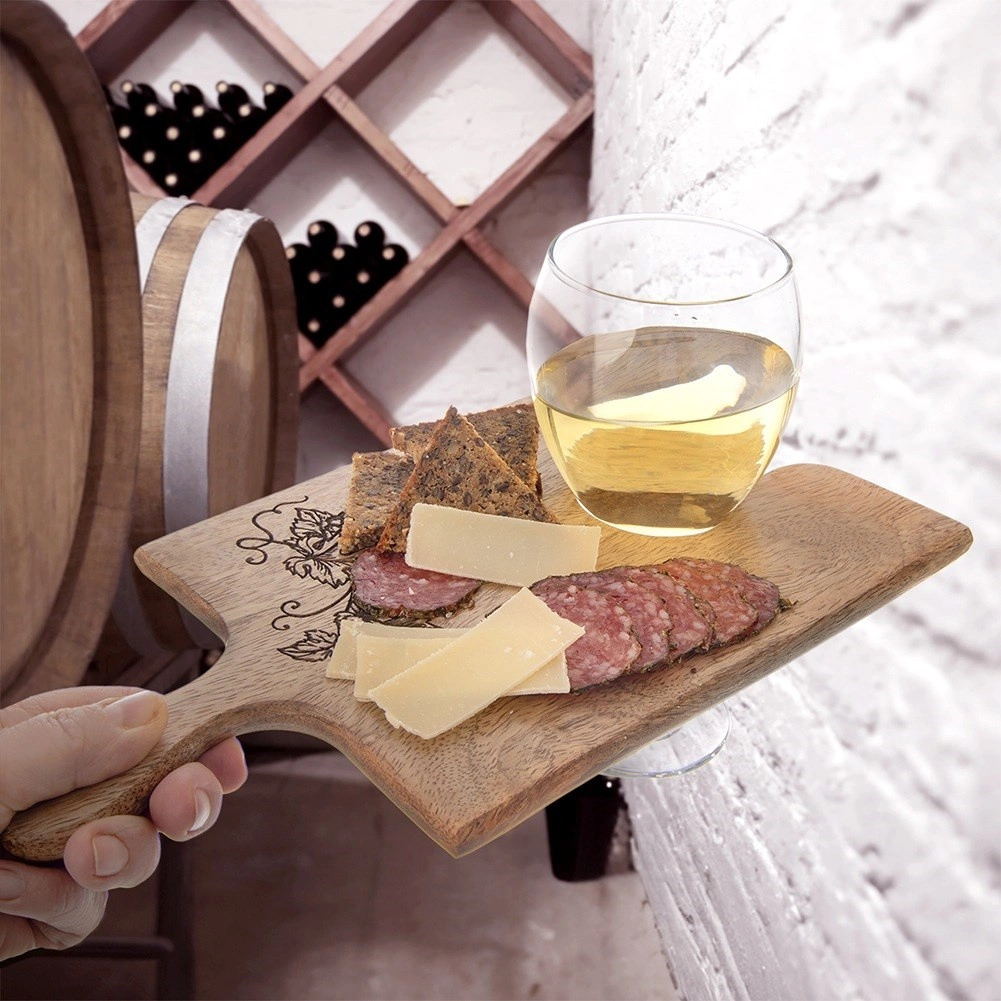 Brættet er ideelt til oste, pålæg, frugt og tapas. Det ergonomiske håndgreb for nem transport og den dekorative graverede vinranke understreger dets elegante udtryk på bordet.