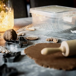 Brug den til opbevaring af bagværk, konfekt, honningkager, småkager, men også til madrester, madpakker, pynt og kreative materialer. Boksen tåler temperaturer fra -20 °C til 95 °C, kan vaskes i opvaskemaskine og varmes i mikrobølgeovn (uden låg).