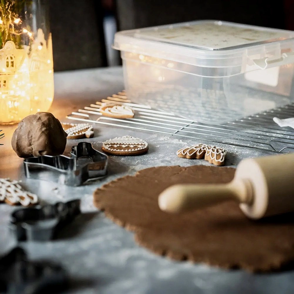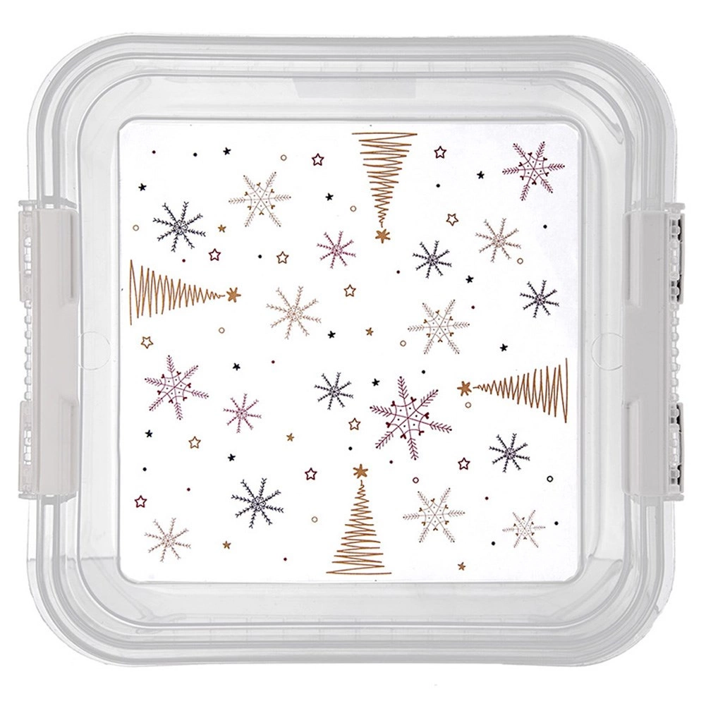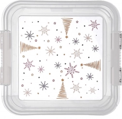 Praktisk og robust boks til daglig brug i køkken og hjem. De gennemsigtige sider giver øjeblikkelig overblik uden at åbne, mens låget med sikre clips holder alt friskt og beskyttet. Det festlige print med stjerner og juletræer glæder især i juletiden.