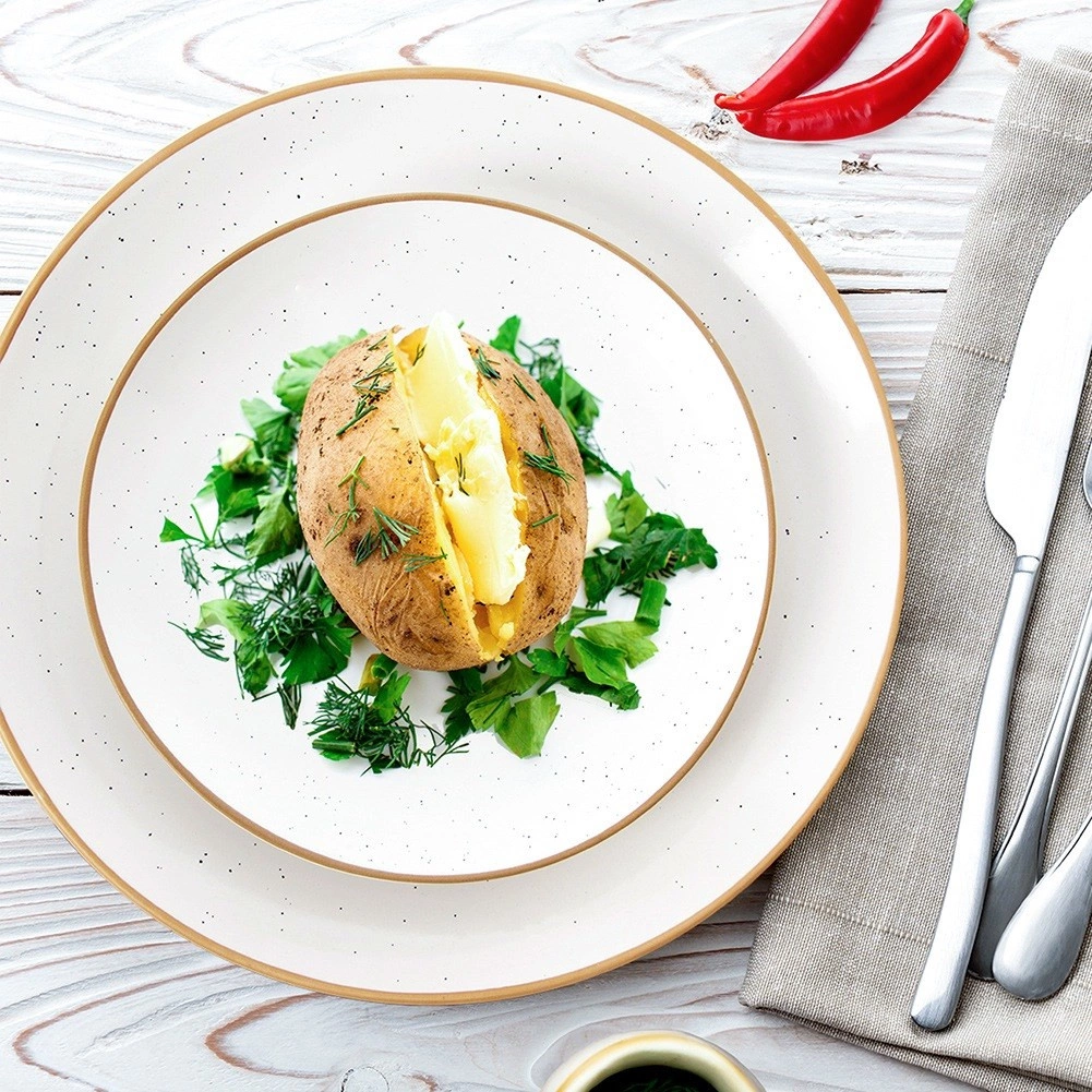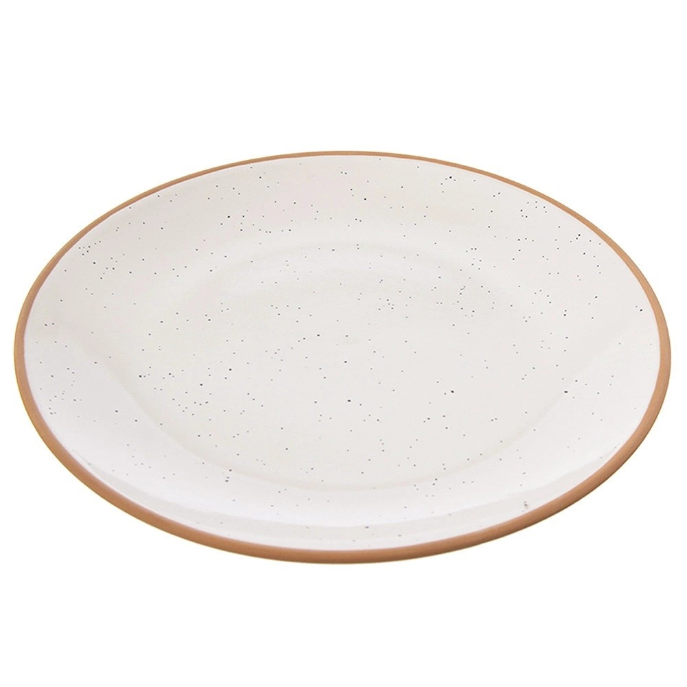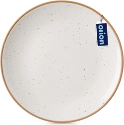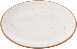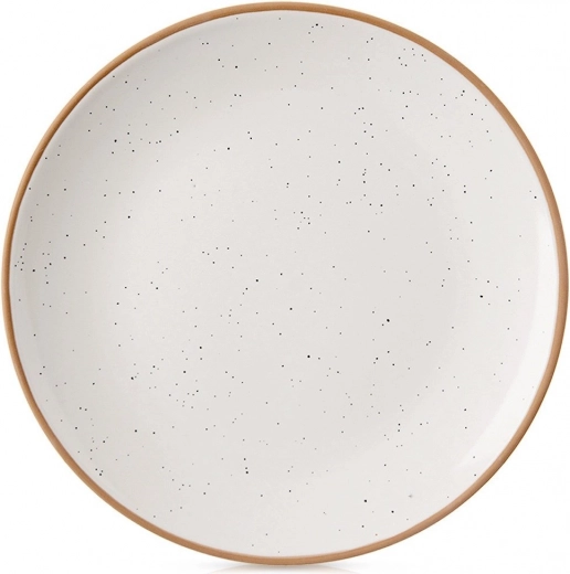Den stilfulde, flade tallerken i kvalitetskeramik udmærker sig ved et moderne, naturligt udtryk: den plettede glasur og den kontrasterende stenkant giver borddækningen et tidløst præg. Den brede og flade form giver rigelig plads til servering af hovedretter, salater og desserter.