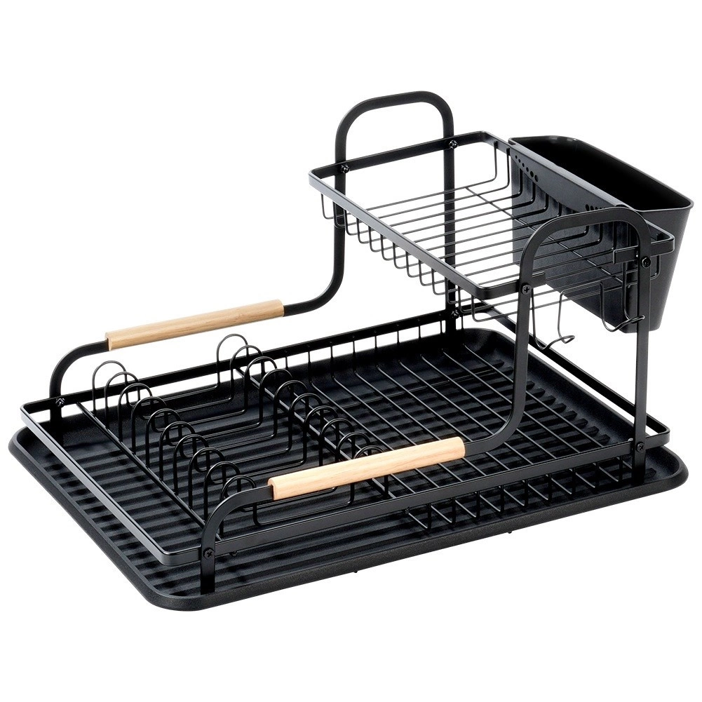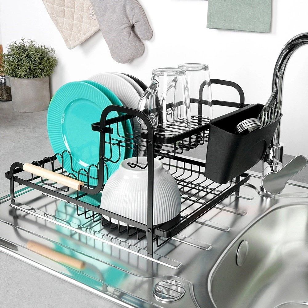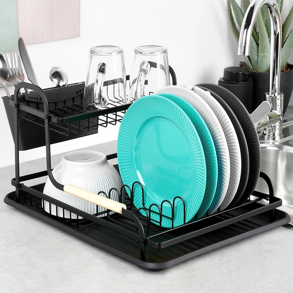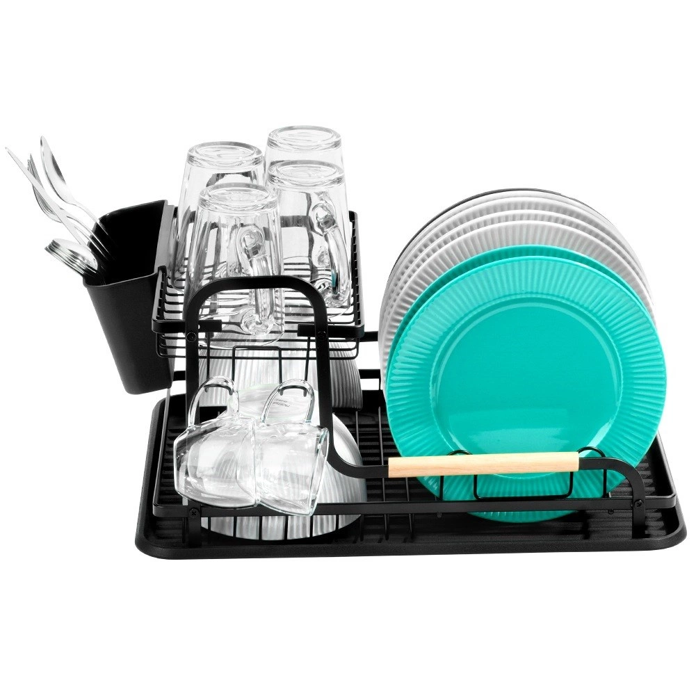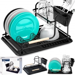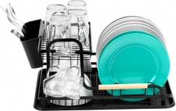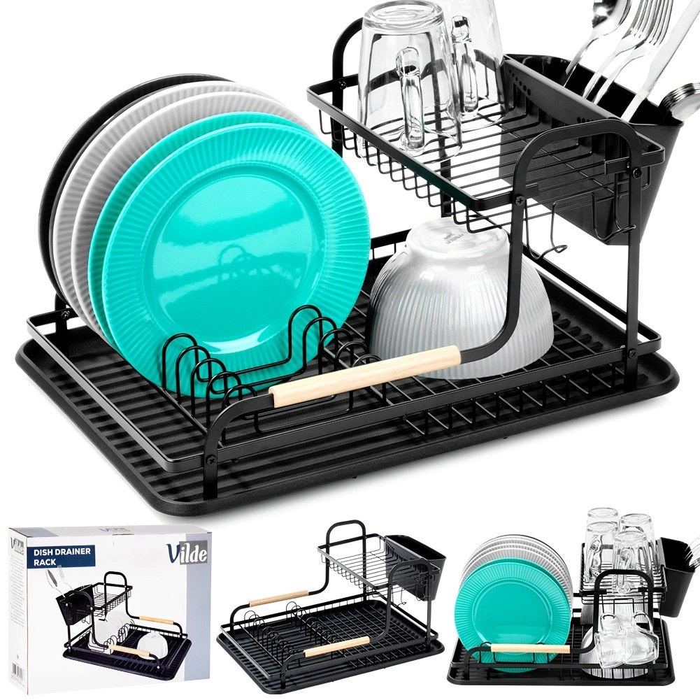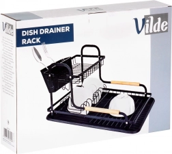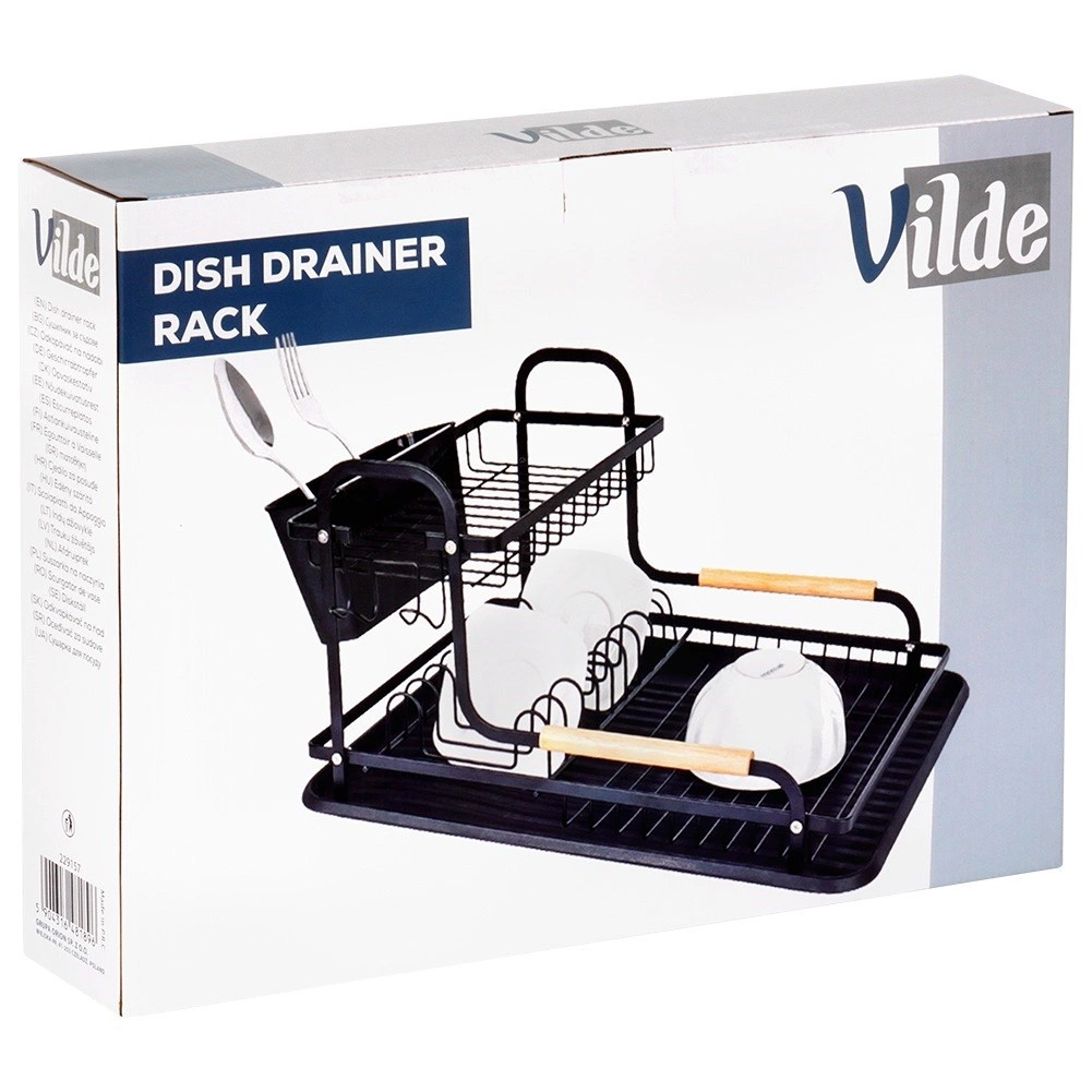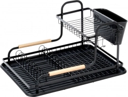 Den robuste ramme af holdbart metal i sort mat finish suppleres af elegante træhåndtag for nem transport. Den aftagelige bestikkurv med to rum hjælper med at holde orden og fremskynder tørringen. Stativet er let at rengøre og designet til daglig komfort.