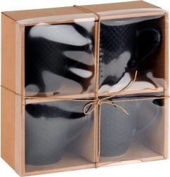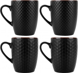 Oplev et praktisk og elegant sæt med 4 krus i kvalitetskeramik i sort med plastisk geometrisk mønster. Takket være den behagelige hank, den rare overflade og den stabile form er de skønne at drikke varm kaffe, te og kakao af. Det matte design med kontrastkant virker moderne og passer nemt ind i ethvert køkken.