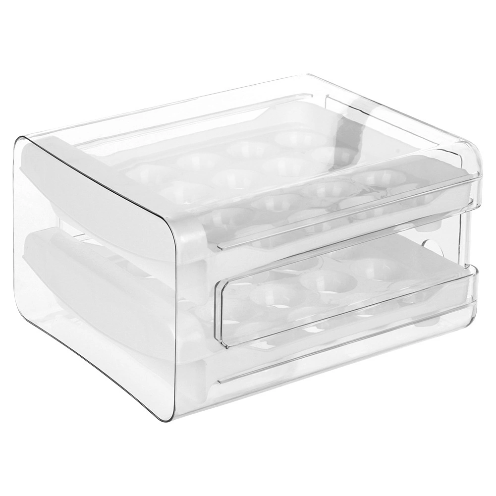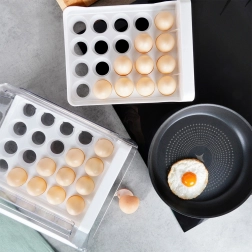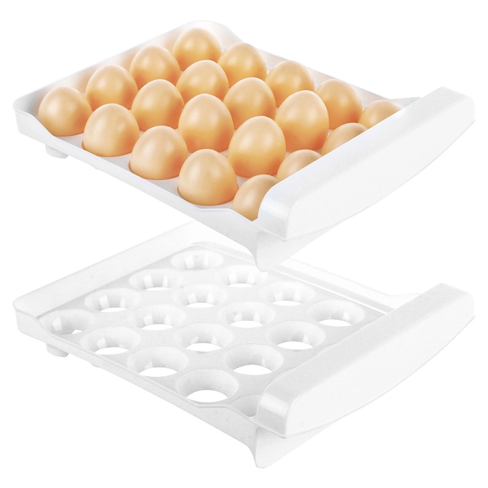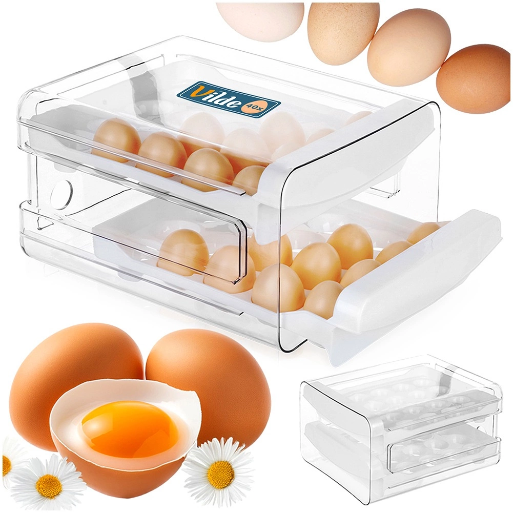 Hold styr på køleskabet med en to-etagers æggeholder med kapacitet på 40 stk (20 stk pr. niveau). Det transparente låg og de hvide indsatser med specialformede fordybninger sikrer stabilitet uden at æggene ruller. Den smarte løsning beskytter æggene bedre mod skader og hjælper dem med at holde sig friske længere.