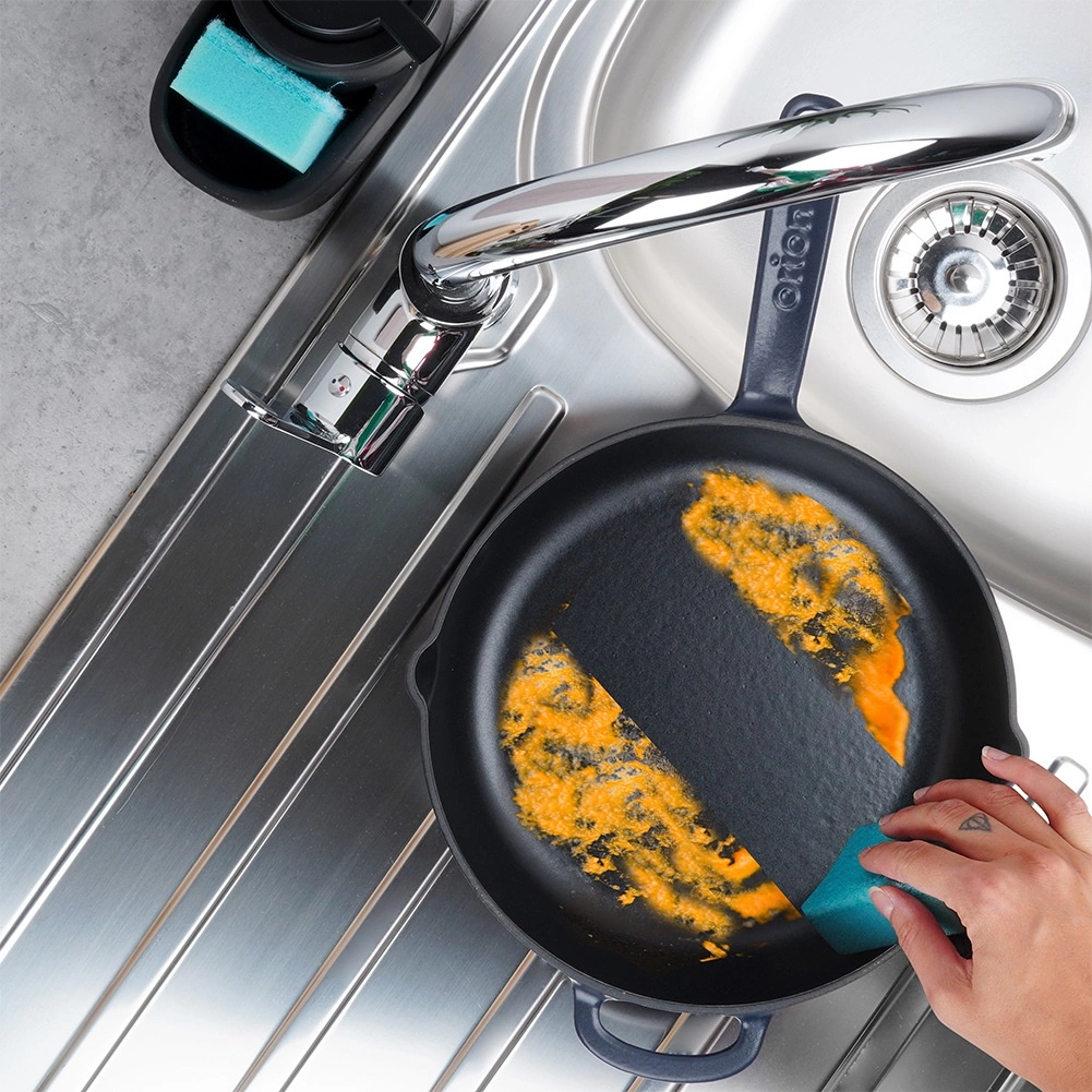 Den sorte emalje indvendigt gør madlavning og rengøring lettere, mens den blå yderside giver panden et elegant udseende. Tåler opvaskemaskine (håndvask anbefales).