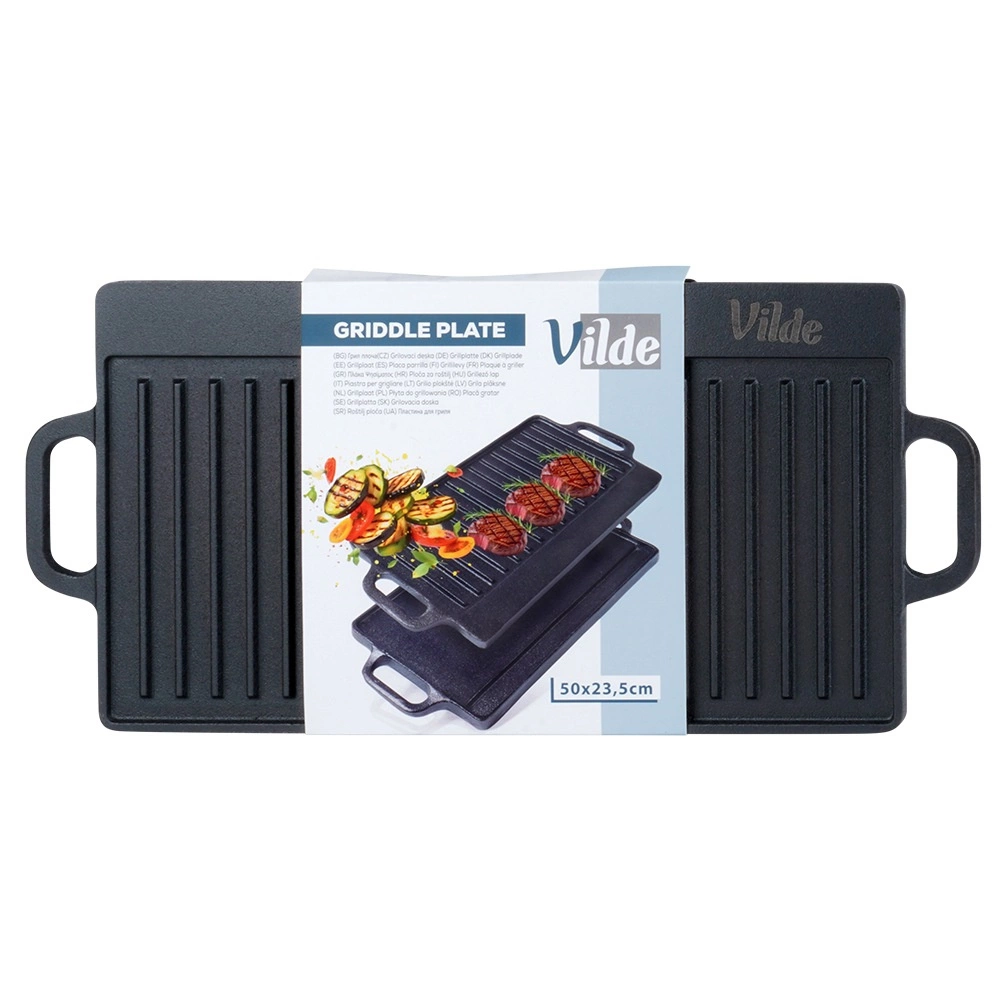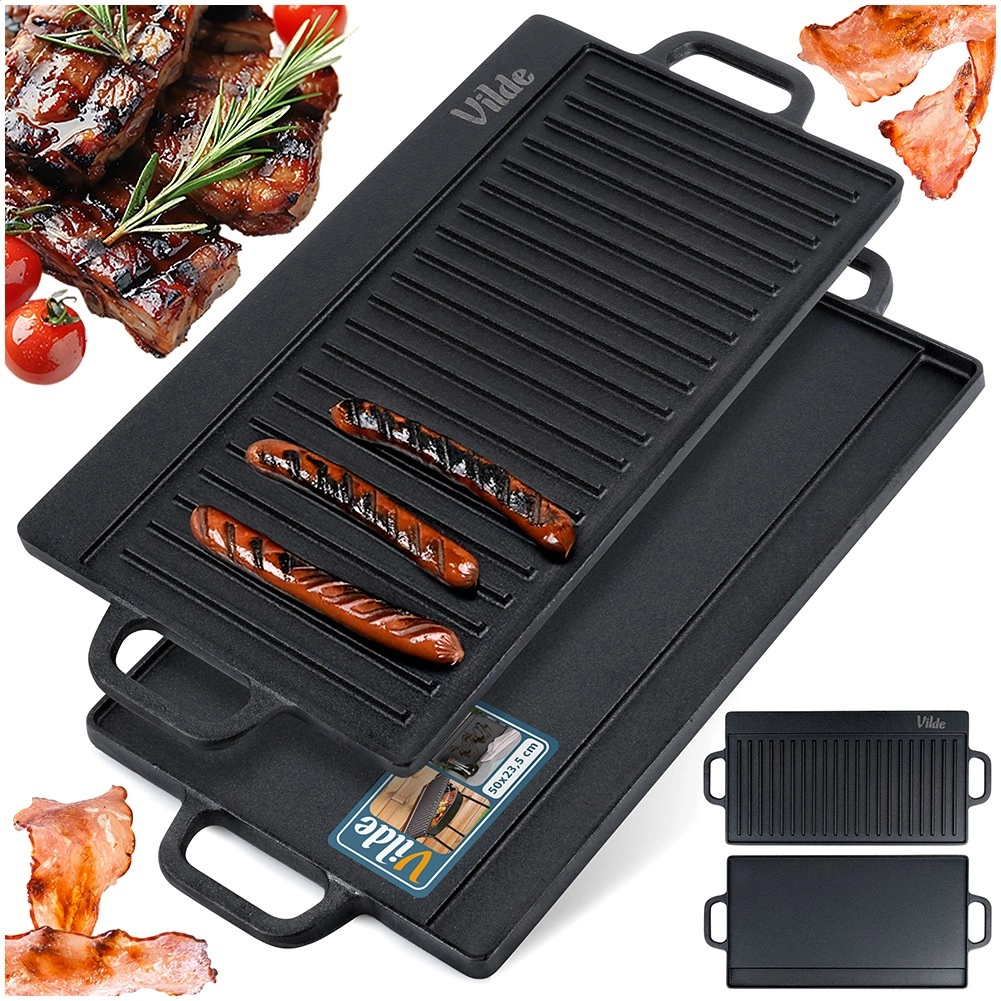 Den alsidige, dobbeltsidede støbejernsgrillplade CAST LINE i størrelsen 50,5 × 23,5 cm har én riflet og én glat side til perfekt tilberedning af kød, fisk, grøntsager og steaks. Den massive støbejern fordeler varmen fremragende og holder på den længe, så du opnår jævn gennemstegning og flotte sear-striber. Velegnet til grill, komfur og ovn.