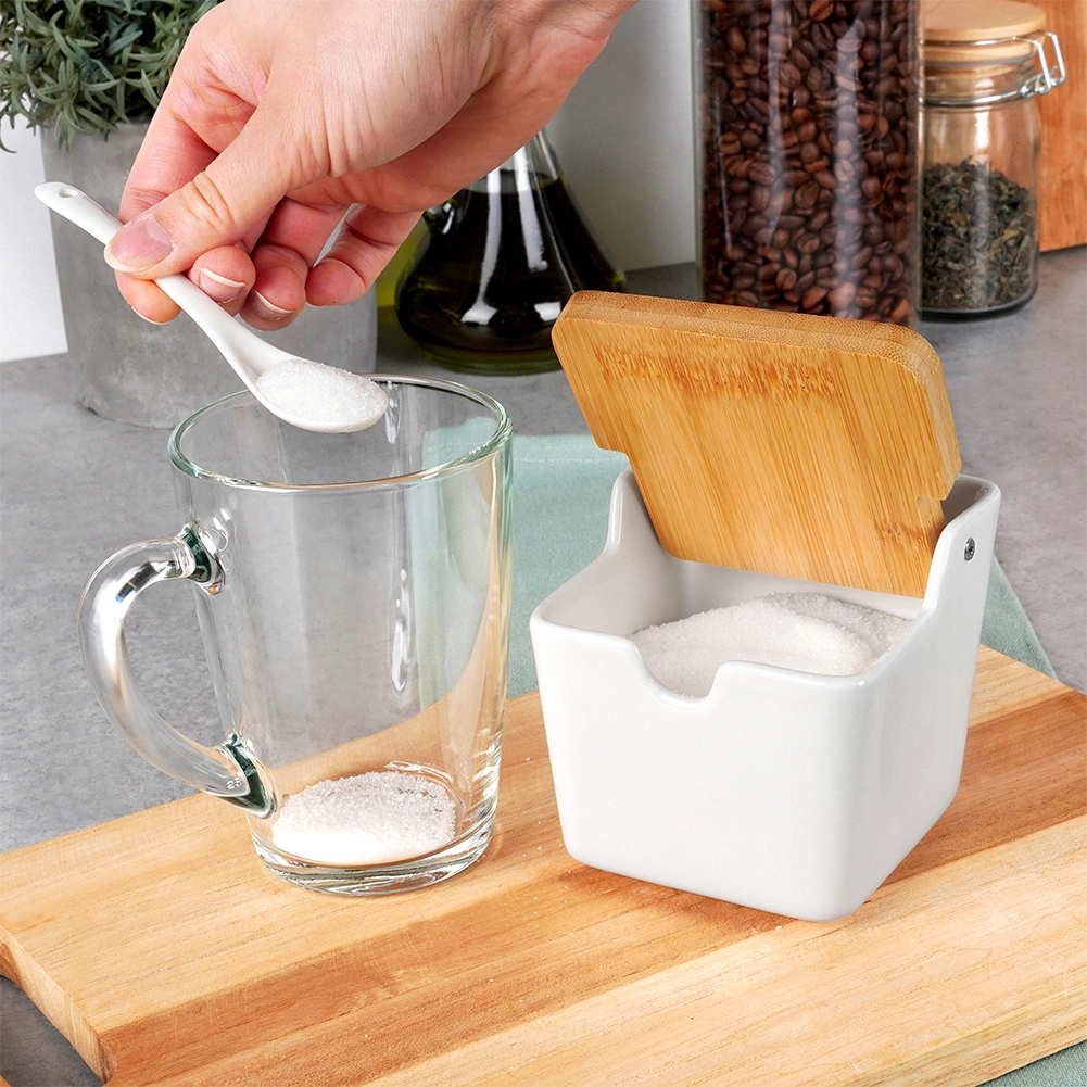 Denne kompakte sukkerskål (9,5 × 9,5 × 9 cm) er fremstillet af holdbar hvid keramik og kompletteres af et vipbart bambuslåg, som beskytter indholdet mod fugt og støv. Inkluderer en matchende keramisk ske (13 cm) med en smart plads til opbevaring, så den altid er lige ved hånden.