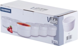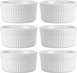 Praktisk sæt med seks hvide ovnfaste skåle på 260 ml, der giver en elegant løsning til både bagning og servering. Skålene er lavet af kvalitetskeramik og er varmebestandige op til 350 °C, egnede til ovn, mikrobølgeovn og opvaskemaskine. Takket være det klassiske riflede design og den glatte glasur passer de perfekt til crème brûlée, souflé, små ovnbagte portioner, saucer og snacks.