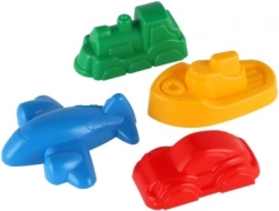 Tog, båd, fly og bil i klare farver motiverer børn til at skabe og lege i sandet og ved vandet.